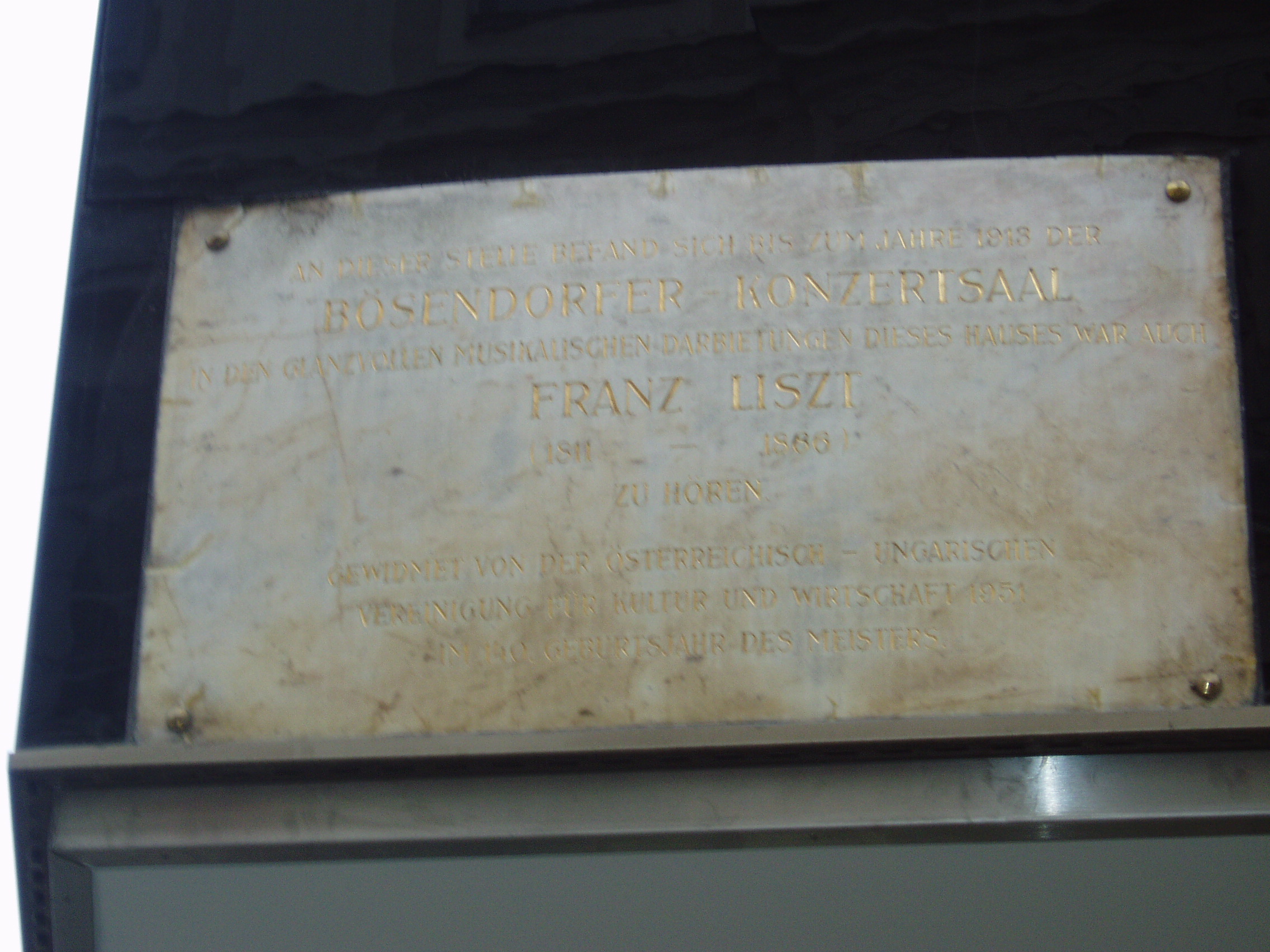Nyilvános 1182 | 1995 | Herrengasse 8. Liszt Ferenc emléktáblája | A mai épület helyén egykor állott házban volt a Bösendorfer zongoragyár koncertterme. Számos jeles muzsikus lépett itt fel, köztük Liszt Ferenc, mint a homlokzaton elhelyezett emléktáblán is olvasható. |