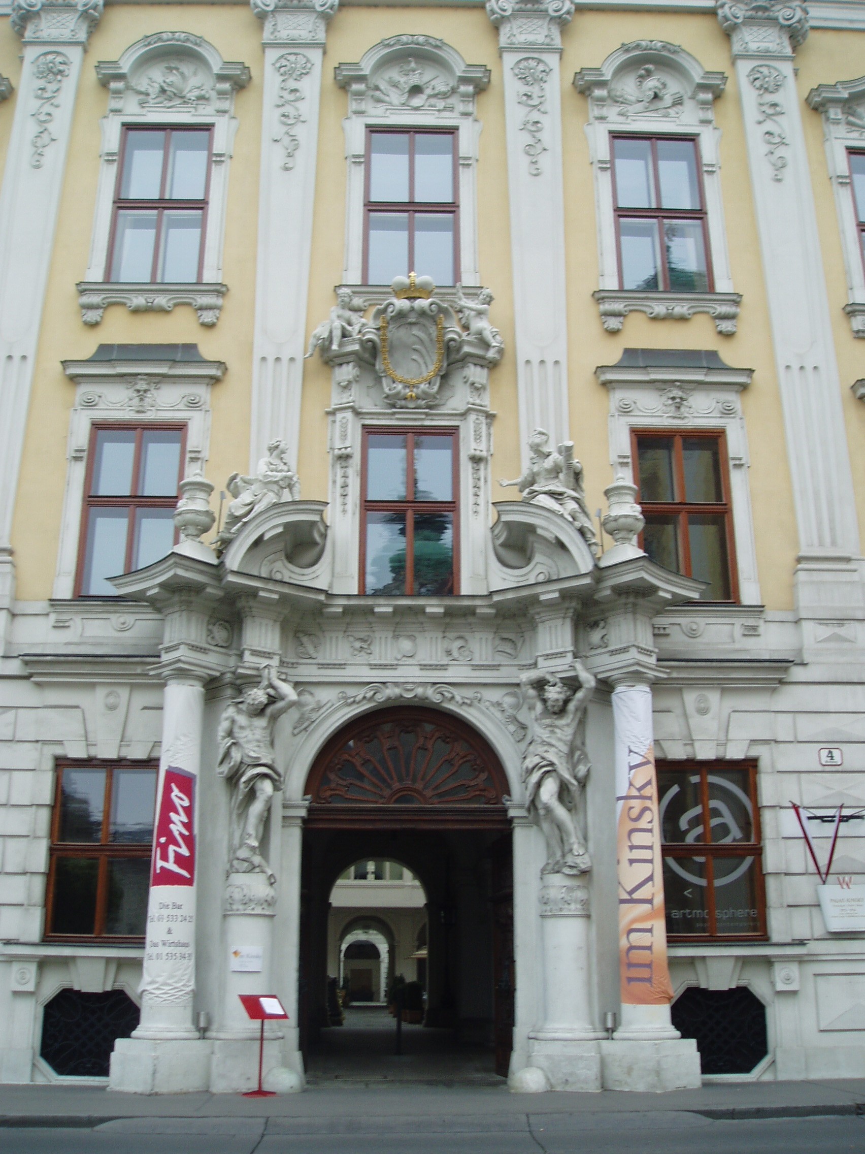 Nyilvános 1613 | 3665 | Freyung 4. Kinsky-palota | A Kinsky hercegi család városi palotáját 1713-16 között a bécsi barokk építészet Fischer von Erlach mellett másik legkiválóbb mestere, Johann Lucas von Hildebrandt építette át eredetileg annak a Daun grófnak a megbízásából, akinek a fia, Leopold Joseph Daum Mária Terézia egyik hadvezére lett Monumentális szobrok állnak a bejárat két oldalán és a bejárat felett; hasonló méretűek emelkednek magasba a harmadik emeletet szegélyező tetőpárkányon. Ha áthaladunk a bejárati kupolacsarnokon, két nagy belső udvar tárul fe előttünk. Az első udvart a palota barokk szárnyépületei állják körül. A hátsó udvart a palota még későbbi, már klasszicista stílusban emelt szárnyépületei szegélyezik. A lépcsőház a legszebbek egyike Bécsben. Az előcsarnok ovális boltozata fölött az első emeleten ovális alaprajzú a díszterem is, mennyezetén Carlo Carlone freskójával. Az első emeleti szalon mennyezetén négy kör alakú festményt helyeztek el, amelyek a művészetek szimbólumait jelenítik meg. Amikor Kinsky Ferdinand herceg volt e palota ura, Beethoven zenetanárként kezdett bejáratos lenni a házhoz; később a fényes estélyek vendégeit zongoravirtuózként és saját szerzeményei előadójaként is megnyerte művészetének. Midőn 1809-ben azzal a gondolattal foglalkozott, hogy elhagyja Bécset és Kasselbe megy, Kinsky herceg kezdeményezésére Rudolf főherceg és Lobkowitz herceg közösen életjáradékot biztosítottak a művésznek (ezen belül Kinsky adta a nagyobb összeget); a herceg feleségének, akiről Beethoven azt mondta, hogy „Bécs legcsinosabb és legkövérebb asszonya”, három, Goethe-versekre írt dalát ajánlotta a mester. |