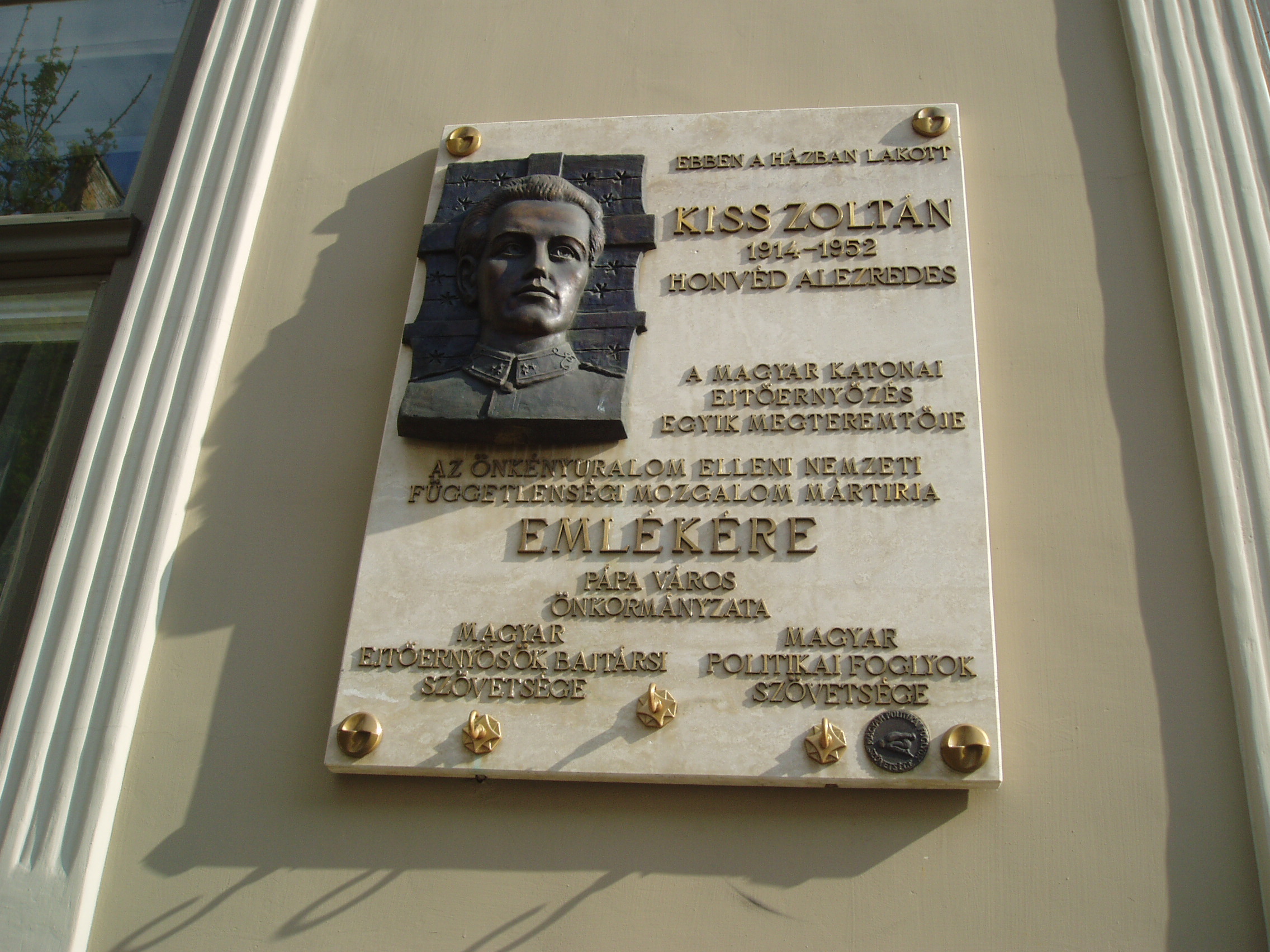 Nyilvános 1153 | 1950 | Pápa, Deák Ferenc utca 2. | Ebben a házban lakott Kiss Zoltán (Fadd, 1914. jan. 18. – Bp., 1952. ápr. 11.), a magyar katonai ejtőernyőzés egyik megteremtője. 1938-ban fiatal hadnagyként került a Bertalan Árpád által szervezett ejtőernyős kísérleti keretbe és azzal együtt Pápára. 1941-ben, Bertalan halála után az egység parancsnokává nevezték ki. 1944-ben ezredesként vett részt a második világháborúban. 1945 után a repülőakadémia ejtőernyős kiképzője volt, de 1951-ben letartóztatták, 1952-ben koholt vádak alapján halálra ítélték és kivégezték. A fénykép 2007 áprilisában készült. Felh. irod.: Veszprém megyei életrajzi lexikon. Veszprém, Veszprém Megyei Önkormányzat Közgyűlése, 1998 Veszprém megyei életrajzi lexikon. Veszprém, Veszprém Megyei Önkormányzat Közgyűlése, 1998 |