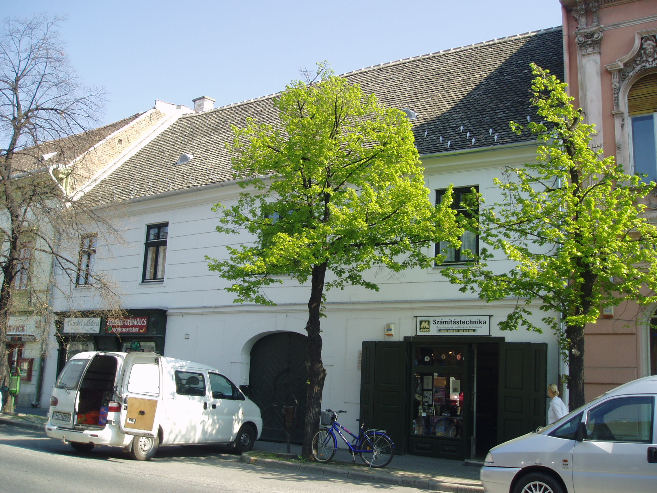Nyilvános 1122 | 1802 | Pápa, Fő utca 6. Református lelkészlak | A református lelkészlak egyszerű, egyemeletes épület,. 1750 körül emelték barokk stílusban; sajnos, az átépítések következtében nagyrészt elvesztette eredeti arculatát. Udvarán - és a Fő utca 4. számú ház udvarán - áll a Református Ótemplom, azon a helyen, ahol 1718-1752 között egy fészer szolgált az istentisztelet helyszínéül. Az ótemplom felépítését II. József türelmi rendelete tette lehetővé 1783-ban. A rendeletben előírtak betartásával a templom nem az utca homlokzatvonalában, hanem zárt udvaron és torony nélkül épülhetett csak fel. A templom a késő barokk - kora klasszicista stílusú református templomok legkorábbi képviselője. 1972-ben nyitották meg benne a Református Egyháztörténeti Múzeum kiállítását. Sajnos jelenleg (2007. április) sem az épület, sem a kiállítás nem látogatható "takarékossági okok" miatt (fényképet sem tudtam róla készíteni, csak az utcafrontról: K. K.). A fénykép 2007 áprilisában készült. Felh. irod.: Németh Adél - Szabó Lajos: Pápa. Bp. Panoráma, 1989 |