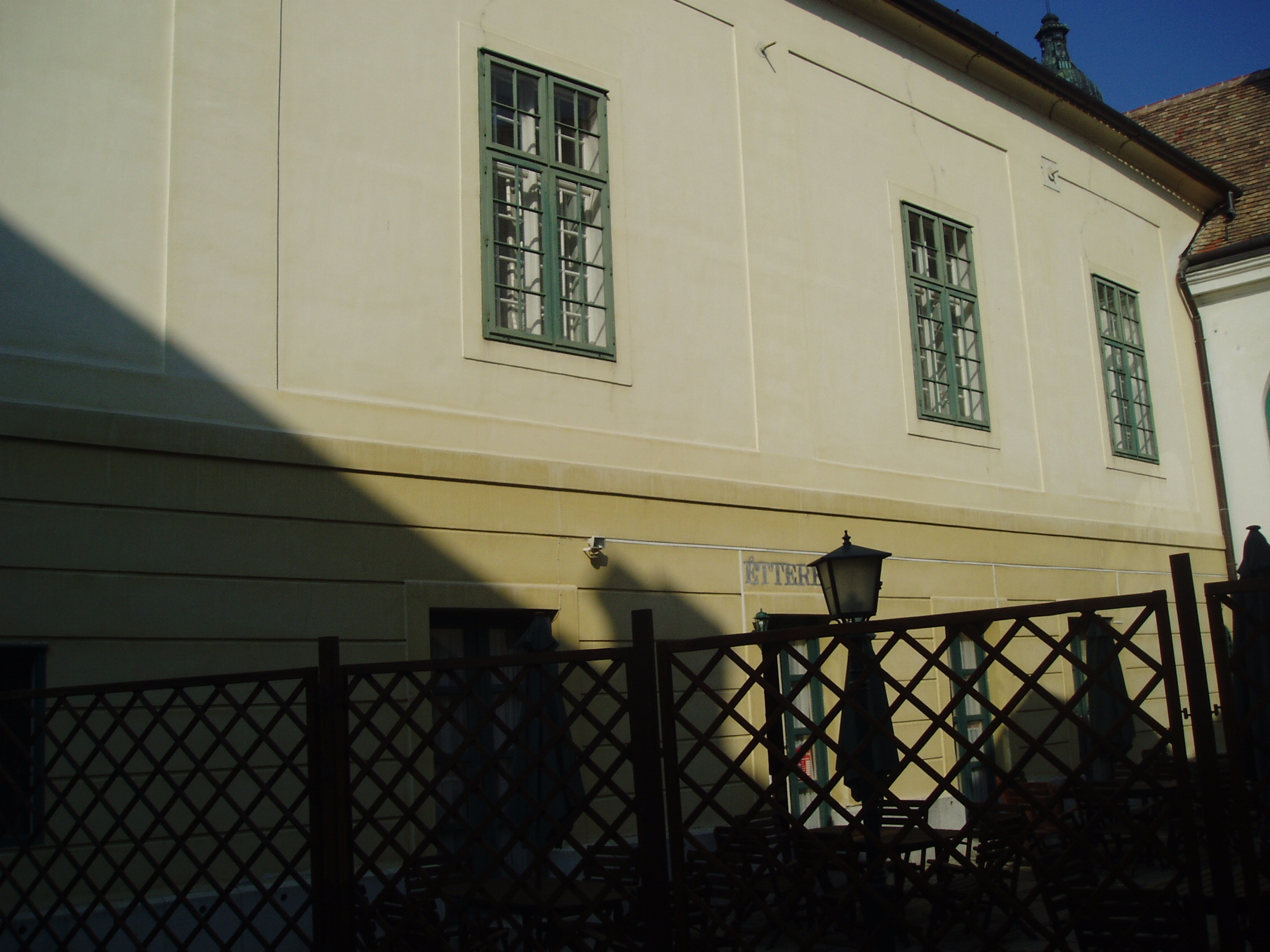 Nyilvános 1133 | 1879 | Pápa, Fő utca 15. Griff Szálló - A Tükörterem belső udvarra néző ablakai | A Fő tér és a Fő utca sarkán áll a Griff Szálló copf stílusú, 1780–1790 között emelt, 1870 körül némileg átalakított épületegyüttese. Nevét az Esterházy család címerállatáról kapta. A Fő utca felőli oldalt Kapuszínnek is nevezik, ugyanis az emelet alatti részen nyílik Pápa sétálóutcájának, a Kossuth utcának a bejárata. A ház másik része a szálloda. A XIX. század folyamán a Griff volt a pápai társas élet központja. Itt alakult meg 1834-ben, Széchenyi István kezdeményezése nyomán — az országban az elsők között — a pápai kaszinó. E jeles eseménynek 1999-ben felavatott vörös márványtábla állít emléket. A Griff ma is meglévő patinás tánctermében — az ún. Tükörteremben — egykor színielőadások és megyebálok zajlottak. Testőrtiszt korában táncolt itt leendő feleségével, Szegedy Rózával Kisfaludy Sándor. Jónéhány évtizeddel később Mikszáth Kálmán volt jelen egy itt tartott táncmulatságon, s ez az élmény inspirálta A Noszty fiú esete Tóth Marival című regényének báli jelenetét. A XIX. század legelejétől 1881-ig, a pápai kőszínház (lásd: Pápa, Március 15. tér) megépítéséig a városba érkező különböző színtársulatok — kevés kivétellel — a Griff nagytermében tartották előadásaikat. A magyar színjátszás nagy egyéniségei közül játszott itt Déryné és Kántorné is. 1842-ben a színielőadások rendszeres látogatója volt két pápai diák, akik maguk is színészi–művészi vágyakat melengettek szívükben: Petőfi Sándor és Jókai Mór (akkor még Petrovics Sándor és Jókay Móric). Petőfi már itt tapsolhatott későbbi jóbarátjának, Egressy Gábornak, aki nevezetes szerepeiben lépett fel a társulat vendégeként — többek között Hamletet és Lear királyt játszotta. A társulat vezető színésznője Szatmáryné Farkas Lujza volt, aki elbűvölte a kamasz Petőfit. Petőfi és Jókai tiszteletüket kívánták tenni a művésznőnél, akit azonban éppen egy társnőjével civakodva találtak a Griff folyosóján. Petőfi — kiábrándulva — ekkor írta meg Szín és való című költeményét, amellyel aztán két arany pályadíjat nyert. A teremben sok jeles hangversenyt is rendeztek. 1937-ben fellépett itt Bartók Béla is fiatal kamarapartnerével, Gertler Endre hegedűművésszel. E nevezetes koncert 60. évfordulóján, 1997-ben emlékhangversenyt rendeztek ugyanitt, melyen részt vett az akkor már 90 esztendős Gertler Endre is. Mindkét eseményről vörös márványtábla emlékezik meg a Tükörteremben. A fénykép 2007 áprilisában készült. Felh. irod.: Pápa. Szerk. Sz. Farkas Aranka. Bp., Magyar Képek, 2000. Németh Adél – Szabó Lajos: Pápa. Bp. Panoráma, 1989 Nádasdy Lajos: A pápai kőszínház története 1817–1931. Veszprém, 1981, Veszprém megyei Tanács www.kincsestar.radio.hu/harangok "A kényes úrfi s a rongyos baka". Tanulmányok két halhatatlan pápai diákról. Pápa, Pápai Református Gyűjtemények, 2001 |