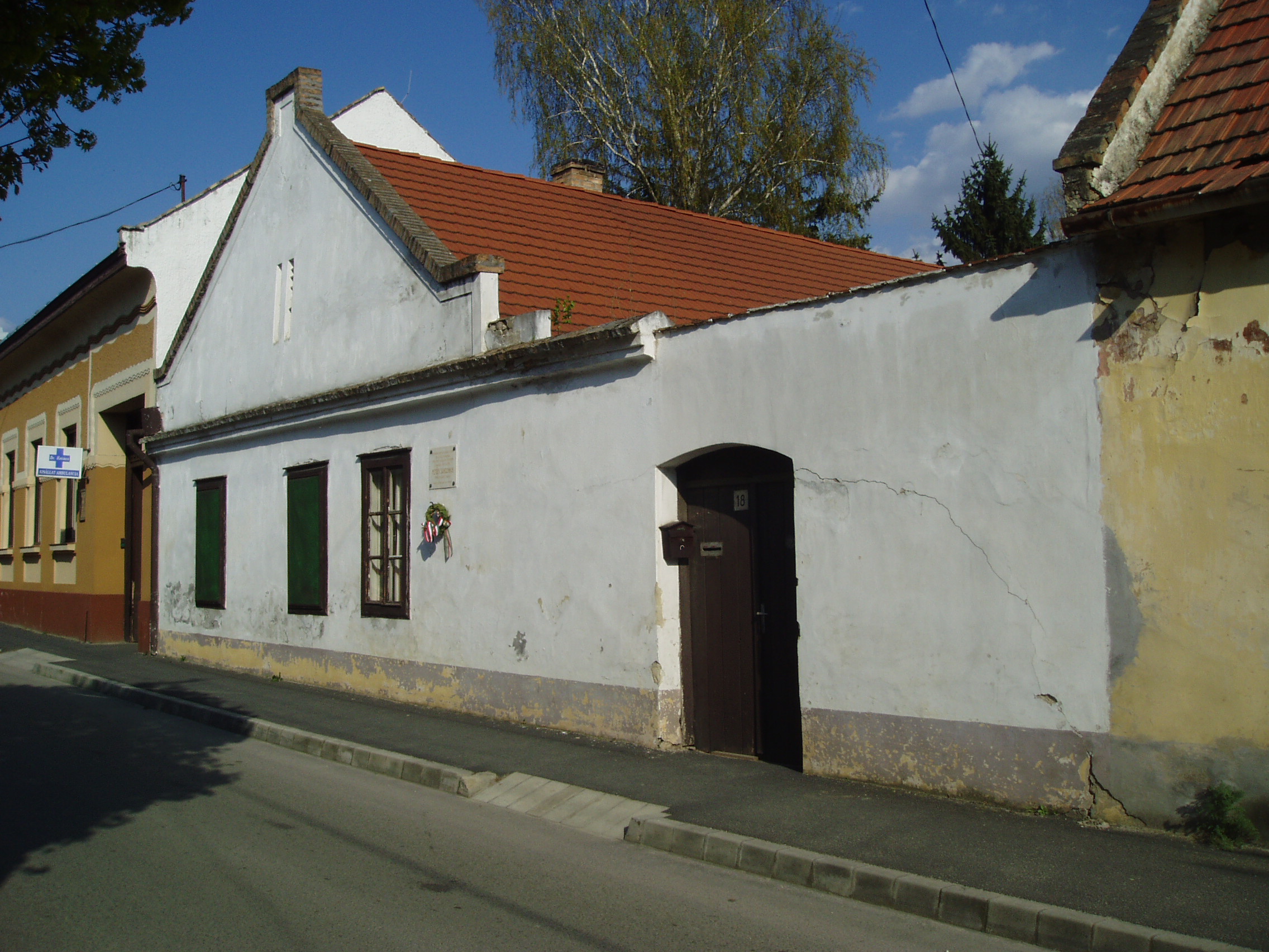 Nyilvános 1136 | 1788 | Pápa, Gyurátz Ferenc utca 18. | Mint a homlokzaton elhelyezett emléktáblán is olvasható, ebben a kis házban lelt először otthonra Pápán Petőfi Sándor 1841 márciusában. Petőfi - akkor még Petrovics - Sándor akkor szerelt le a kis híján katasztrófával végződő katonai szolgálatból, s reménytelen helyzetben volt: iskoláit félbehagyta, apja kitagadta. Ekkor ment Pápára, mert tudta, hogy unokatestvére, Orlai Petrich Soma az ottani kollégiumban tanul. Akkor ebben a kis házban egy Kis Gábor nevű diák is volt koszton-kvártélyon, s mivel Orlai Petrich még nem ért haza az iskolából, a háziasszony őt kérte meg, hogy vigye szobájába Petőfit, aki iránt külseje miatt bizalmatlan volt. Kis Gábor később így emlékezett: "Elképzelhetni, milyen lehetett a sors üldözte, ágról szakadt isten-katonája, az ő megviselt uniformisában. És ne vegye senki rossz néven, ha a rendet annyira kedvelő háziasszony ugy nyilatkozott előttem. Dehogy hitte, de ki is hitte volna, hogy az a katona egykor a Dalaim és Magyarország annyi dalainak szerzője. Bementem Petőfiért, ott ült a háziasszony szobájában egy széken, a 'sárgapitykés, zöldhajtókás közlegény': mellette a padlón ellapulva hevert az üres vászontarisznya, a bot az ágynak támaszkodott görcsös fejével ... Magam bemutatása rövid volt, mit is mondhattam volna sokat, a lábain céhláda nagyságu bakancsokban előttem álló Petőfit vendégemül meghívám, ő vette a botot és a tarisznyát s mentünk ... a mi szobánkba... Hazajött Orlay ... A legelső estét a mi szobánkban töltöttük; ... a barátság melegénél, mert borunk kevés volt, felmelegedett az elcsigázott, vézna alaku költő, csak hamar láng csapott ki homlokán, szavalt idegen költők műveiből, Horác ódáit egymásután mondta könyv nélkül..." Körülbelül három hétig tartózkodott itt Petőfi, amikor elhagyta Pápát, mert édesapjától megbocsátó levelet kapott. A fénykép 2007 áprilisában készült. Felh. irod.: Németh Adél - Szabó Lajos: Pápa. Bp. Panoráma, 1989 Petőfi emlékhelyek a Kérpát-medencében. Kiskőrös, 1996, Petőfi Sándor Társaság "A kényes úrfi s a rongyos baka". Tanulmányok két halhatatlan pápai diákról. Pápa, 2001, Pápai Református Gyűjtemények |