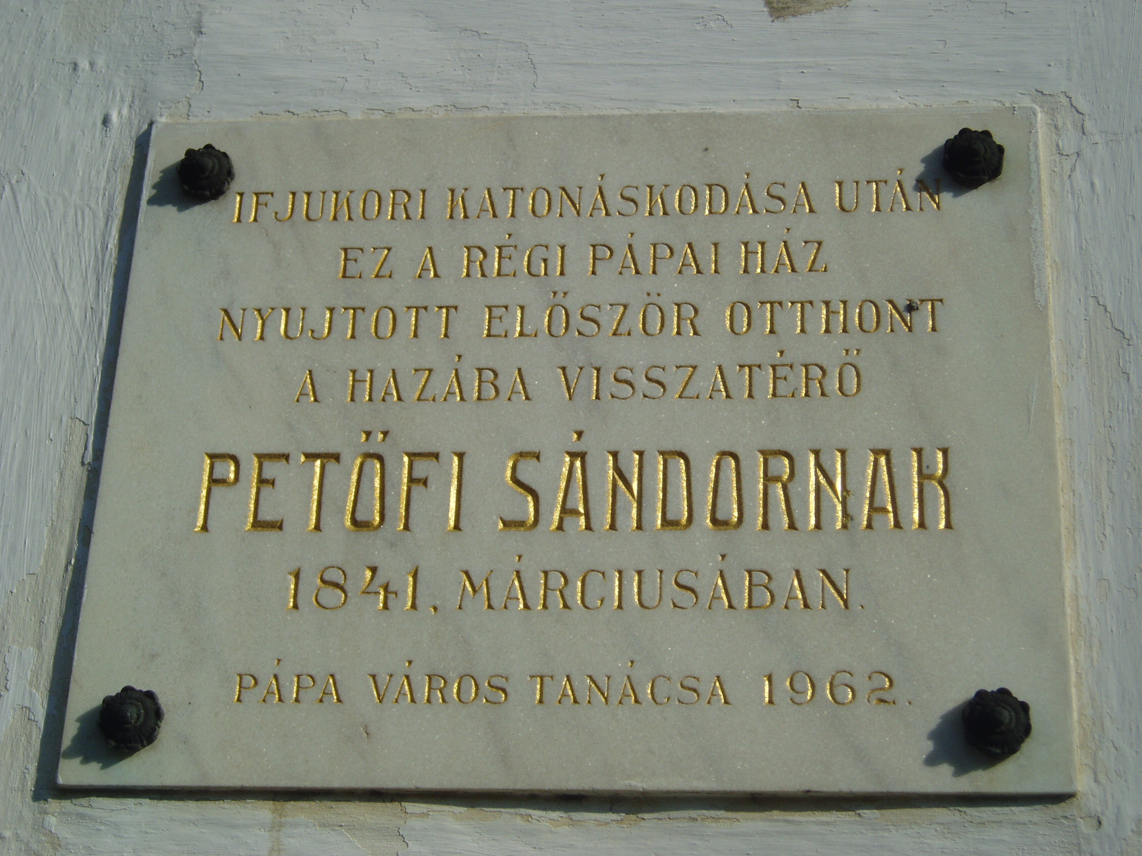 Nyilvános 1143 | 1700 | Pápa, Gyurácz Ferenc utca 18. | Mint a homlokzaton elhelyezett emléktáblán is olvasható, ebben a kis házban lelt először otthonra Pápán Petőfi Sándor 1841 márciusában. Petőfi - akkor még Petrovics - Sándor akkor szerelt le a kis híján katasztrófával végződő katonai szolgálatból, s reménytelen helyzetben volt: iskoláit félbehagyta, apja kitagadta. Ekkor ment Pápára, mert tudta, hogy unokatestvére, Orlai Petrich Soma az ottani kollégiumban tanul. Akkor ebben a kis házban egy Kis Gábor nevű diák is volt koszton-kvártélyon, s mivel Orlai Petrich még nem ért haza az iskolából, a háziasszony őt kérte meg, hogy vigye szobájába Petőfit, aki iránt külseje miatt bizalmatlan volt. Kis Gábor később így emlékezett: "Elképzelhetni, milyen lehetett a sors üldözte, ágról szakadt isten-katonája, az ő megviselt uniformisában. És ne vegye senki rossz néven, ha a rendet annyira kedvelő háziasszony ugy nyilatkozott előttem. Dehogy hitte, de ki is hitte volna, hogy az a katona egykor a Dalaim és Magyarország annyi dalainak szerzője. Bementem Petőfiért, ott ült a háziasszony szobájában egy széken, a 'sárgapitykés, zöldhajtókás közlegény': mellette a padlón ellapulva hevert az üres vászontarisznya, a bot az ágynak támaszkodott görcsös fejével ... Magam bemutatása rövid volt, mit is mondhattam volna sokat, a lábain céhláda nagyságu bakancsokban előttem álló Petőfit vendégemül meghívám, ő vette a botot és a tarisznyát s mentünk ... a mi szobánkba... Hazajött Orlay ... A legelső estét a mi szobánkban töltöttük; ... a barátság melegénél, mert borunk kevés volt, felmelegedett az elcsigázott, vézna alaku költő, csak hamar láng csapott ki homlokán, szavalt idegen költők műveiből, Horác ódáit egymásután mondta könyv nélkül..." Körülbelül három hétig tartózkodott itt Petőfi, amikor elhagyta Pápát, mert édesapjától megbocsátó levelet kapott. A fénykép 2007 áprilisában készült. Felh. irod.: Németh Adél - Szabó Lajos: Pápa. Bp. Panoráma, 1989 Petőfi emlékhelyek a Kérpát-medencében. Kiskőrös, 1996, Petőfi Sándor Társaság "A kényes úrfi s a rongyos baka". Tanulmányok két halhatatlan pápai diákról. Pápa, 2001, Pápai Református Gyűjtemények |