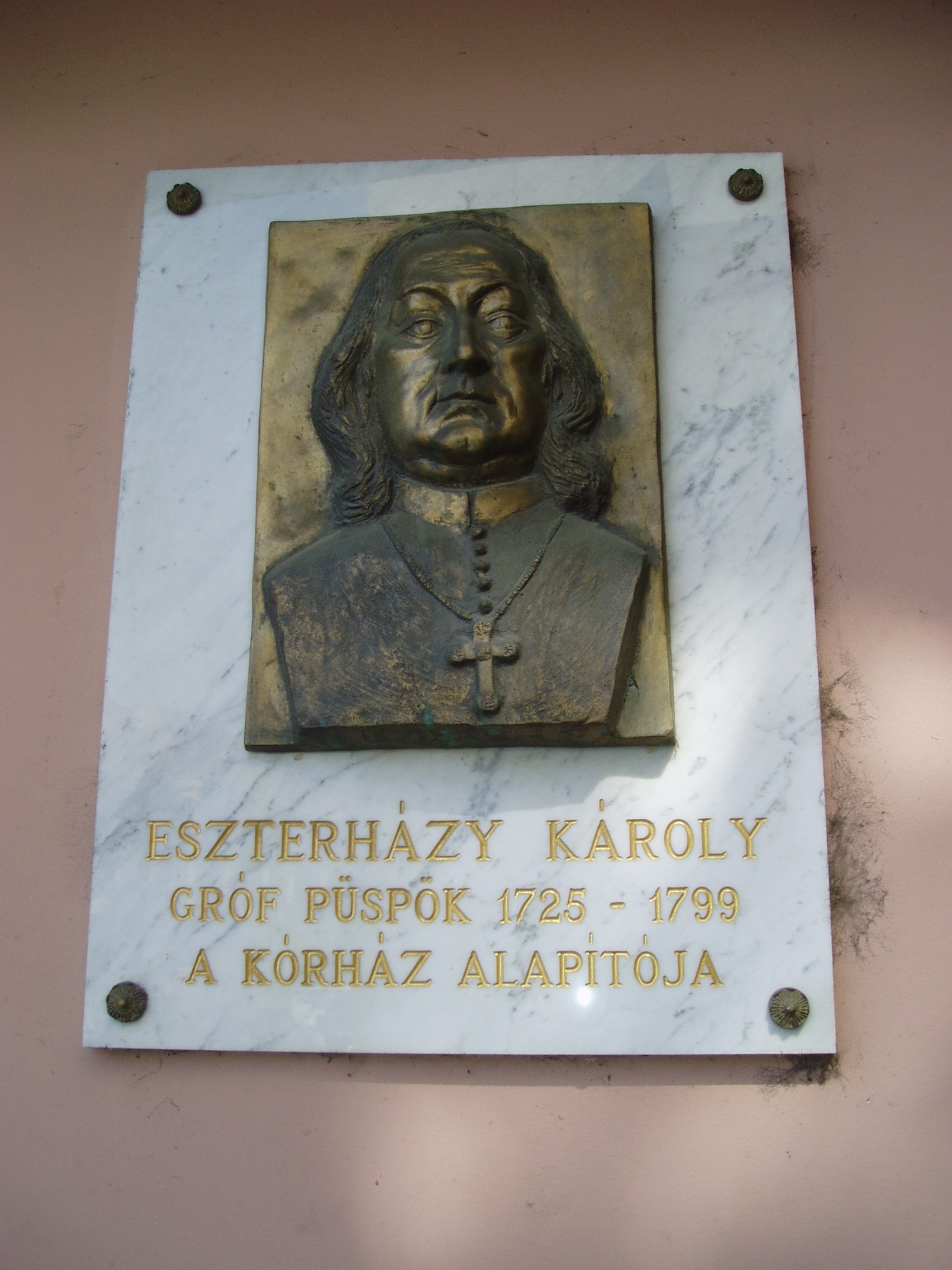 Nyilvános 1195 | 1959 | Pápa, Jókai utca 9. | A kórház közelmúltban átadott új épületén - a régi épület szomszédságában - gróf Eszterházy Károly (1725-1799) portrédomborműves emléktáblája látható. Pápán a kórházi ápolás bevezetése az Esterházy Ferenc által 1730 körül betelepített Irgalmas rend nevéhez fűződik. Pápa városi kórházát 1757-ben alapította Esterházy Károly - akkor váci, majd egri püspök -, Pápa ura. A szomszédos épület (lásd: Pápa, Jókai u. 7.) az ő adományából épült Fellner Jakab vezetésével. A fénykép 2007 áprilisában készült. Felh. irod.: Németh Adél - Szabó Lajos: Pápa. Bp. Panoráma, 1989 Veszprém megyei életrajzi lexikon. Veszprém, Veszprém Megyei Önkormányzat Közgyűlése, 1998 |