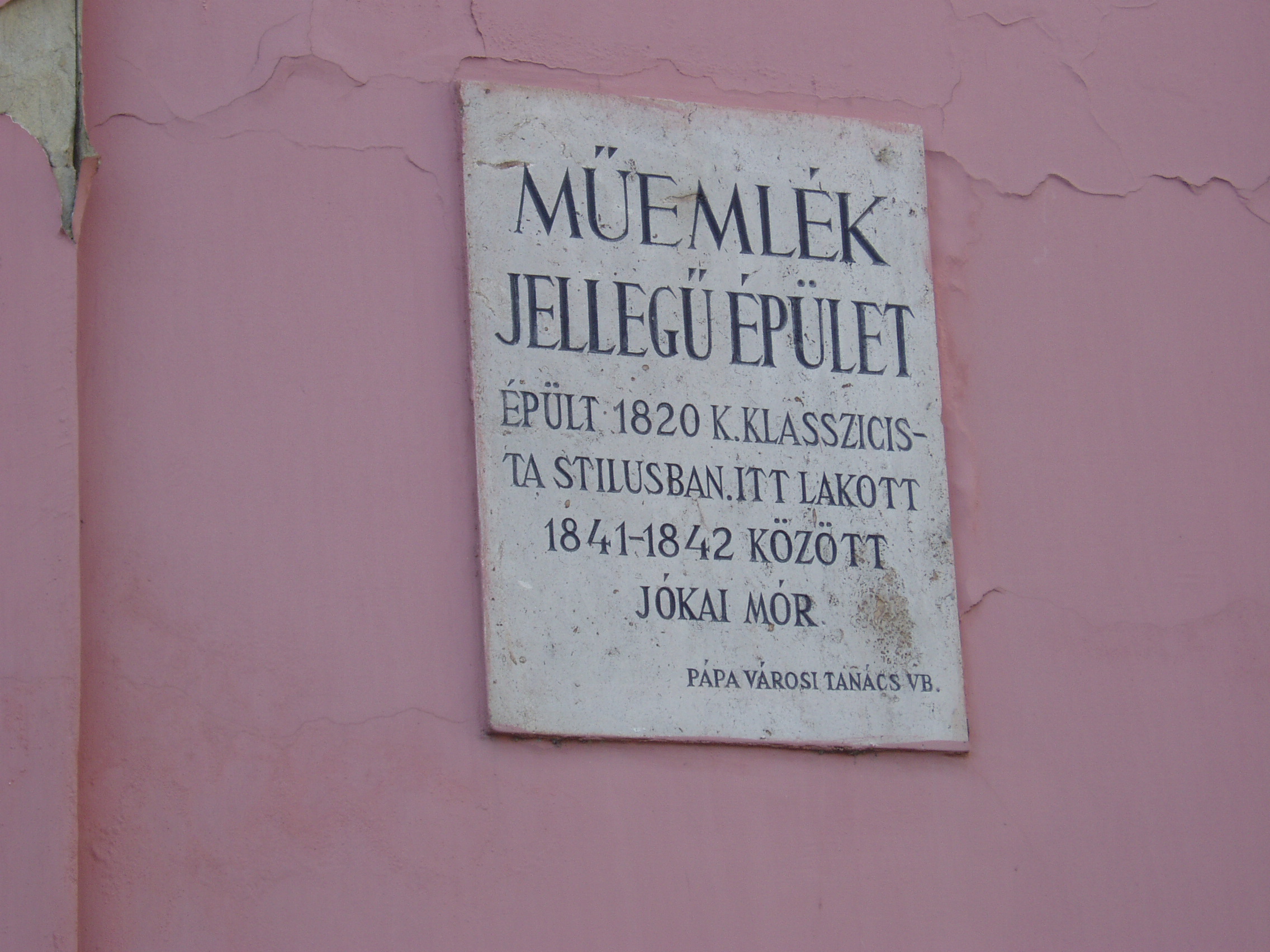 Nyilvános ![]() 735 | 1337 | Pápa, Jókai utca 13. | Klasszicista stílusban, 1820 körül épült egyemeletes lakóház. Homlokzatán emléktábla jelzi, hogy pápai diák korában, 1841/42-ben itt lakott Jókai Mór. Jókai - akkor még Jókay - Mórt sógora, Vály Ferenc hozta Pápára 1841. aug. 21-én különbözeti vizsgát tenni, ami után a fiú a Kollégium (lásd: Pápa, Petőfi u. 13.) diákja lett. Nov. 1-jén költözött be bebbe a házba, Klára Mihály otthonába, kosztosdiákként. (Még idős kori levelében is emlegette a "derék" Klára Mariska főztjét.) Együtt lakott Kerkapoly Károly későbbi filozófiaprofesszorrel és pénzügyminiszterrel és egy Pap Dénes nevű iskolatársával. Az itt töltött időben Jókai jeles előmenetelű diák volt. Tanulmányai mellett portréfestéssel is foglalkozott. Visszavonult, szolíd életet élt, amivel táraitól kiérdemelte a "Jámbor" becenevet. Ebben gyerekkori betegségének, tüdő-problémáinak is része volt. Lakótársain kívül elsősorban Orlai Petrich Somával barátkozott. Petőfivel 1842-ben ismerkedett meg. Eltérő egyéniségük ellenére hamar jóban lettek, sok időt töltött Petőfiék szállásán (lásd: Pápa, Petőfi u. 11.), de igazi barátság csak a későbbi kecskeméti években alakult ki közöttük. Bár még elsősorban festőművésznek készült, de novellákat is írt; az egyikkel második díjat nyert 1842-ben (lásd: Pápa, Fő u. 17.). Itt töltött időszaka, a diákélet szokásai, jeles professzorai nagy hatást gyakoroltak életművére. Különösen sok pápai motívum lelhető fel az És mégis mozog a föld és az Egetvívó asszonyszív című regényeiben. A házat még Jókai életében, 1880-ban jelölték meg emléktáblával (lásd: Pápa, Jókai u. 13. 3.kép). A fénykép 2007 áprilisában készült. Felh. irod.: Németh Adél - Szabó Lajos: Pápa. Bp. Panoráma, 1989 Petőfi emlékhelyek a Kérpát-medencében. Kiskőrös, 1996, Petőfi Sándor Társaság "A kényes úrfi s a rongyos baka". Tanulmányok két halhatatlan pápai diákról. Pápa, 2001, Pápai Református Gyűjtemények |