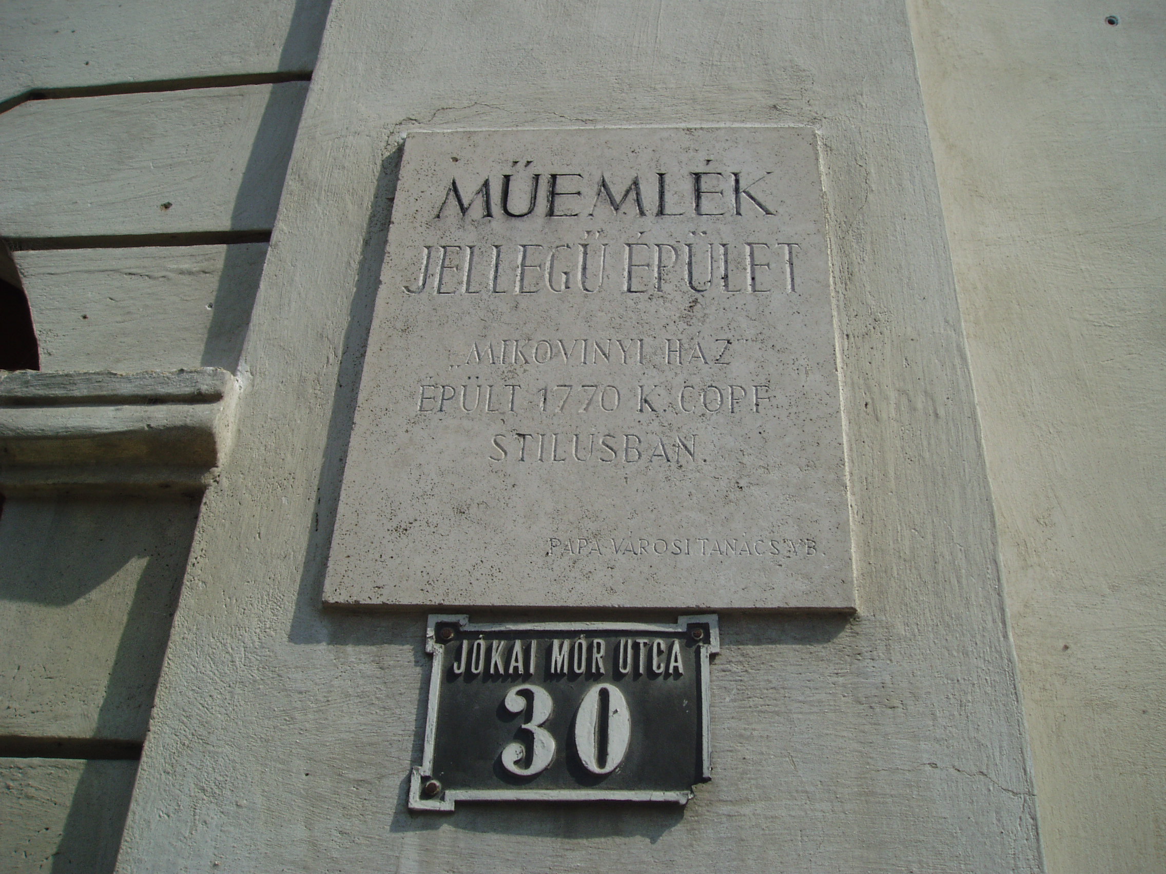 Nyilvános 1107 | 1718 | Pápa, Jókai utca 30. | Az utca talán legszebb épülete az ún. Mikovinyi-ház. 1770 körül épült copf stílusban, Fellner Jakab tervei szerint. Itt lakott kollégiumi diák korában Kerkapoly Károly későbbi pénzügyminiszter. Kerkapoly Károly (Szentgál, 1824. máj. 15. – Bp., 1891. dec. 31.) író, miniszter, történész, jogász. Petőfi és Jókai iskolatársa volt a pápai református kollégiumban (lásd: Pápa, Petőfi u. 13.). Jogot végzett, Halléban és Berlinben egészítette ki tanulmányait. Tehetségét Deák Ferenc is nagyra értékelte. Meghívták Pápára a bölcselet tanárának. A szabadságharcban a veszprémi nemzetőrség tagjaként vett részt. A kiegyezés idején Deák-párti programmal Enying, majd 1869–1878 között Tapolca választotta meg országgyűlési képviselőnek. 1870–1873 között pénzügyminiszter, majd egyetemi tanár. 1878-ban visszavonult, gazdálkodott, faiskolát, gyümölcsöst, szőlőt telepített. Tevékenyen részt vett a kor gazdasági mozgalmaiban. Bölcseleti munkái Hegel, közgazdasági tanulmányai Smith és Ricardo hatását mutatják. A fénykép 2007 áprilisában készült. Felh. irod.: Németh Adél - Szabó Lajos: Pápa. Bp. Panoráma, 1989 Veszprém megyei életrajzi lexikon. Veszprém, Veszprém Megyei Önkormányzat Közgyűlése, 1998 |