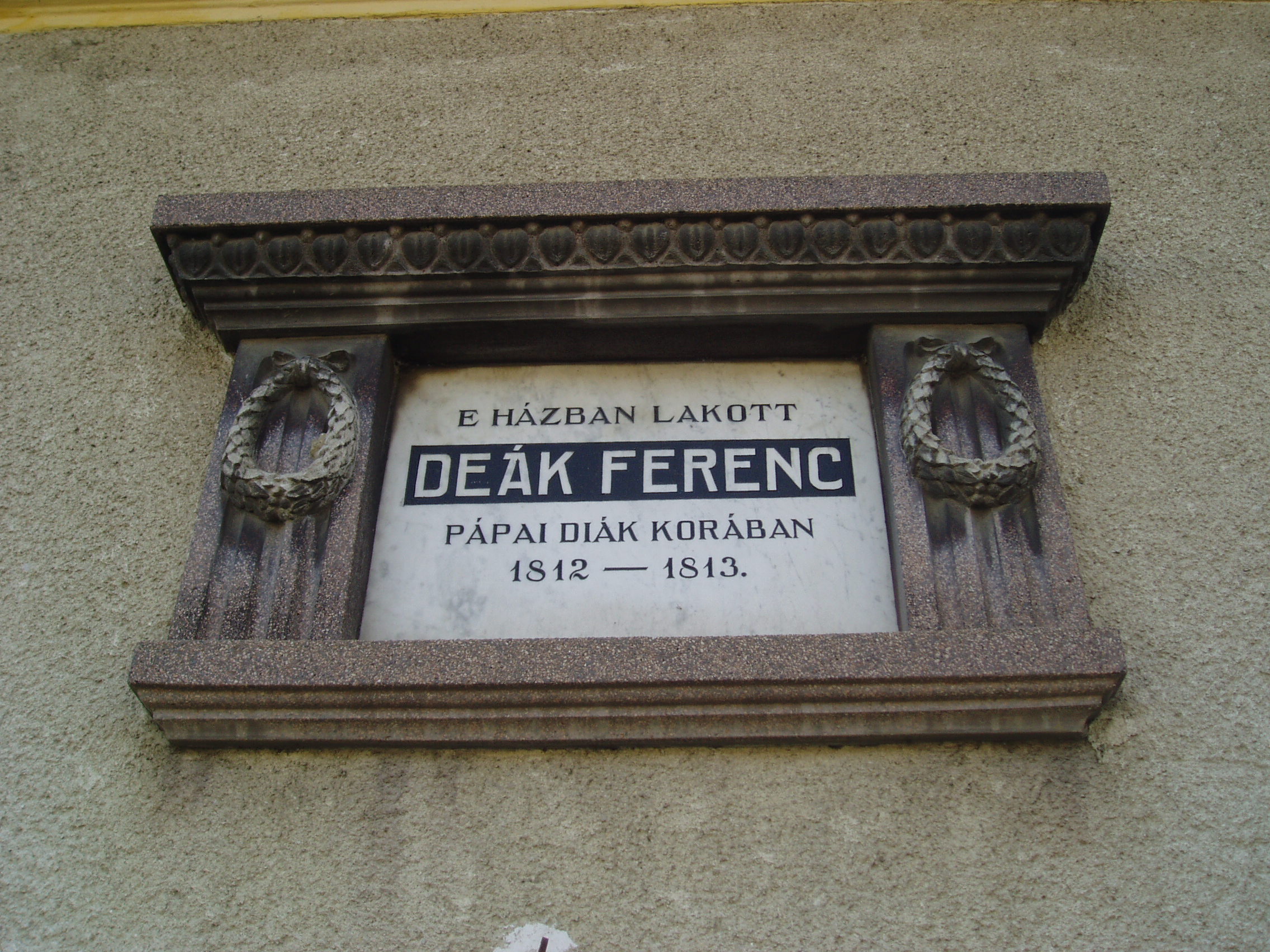 Nyilvános 1115 | 1759 | Pápa, Korona utca 45. | Deák Ferenc 1812/13-ban Pápán járt gimnáziumba. A régi bencés gimnáziumot, amelynek második osztályos diákja volt, 1897-ben lebontották. Helyére épült a mai Türr István Gimnázium (lásd: Pápa, Fő u. 10.). A hét éves kisfiú lakása itt, az akkor Rozmaringnak nevezett utcában volt egy özvegy kasznárnénál. Egykori lakóházát 1935-ben azonosították, ekkor került rá a ma is látható emléktábla. A fénykép 2007 áprilisában készült. Felh. irod.: "Zalának büszkesége". Helyszínek, arcok, események Deák Ferenc életéből. Zalaegerszeg, Zala Megyei Levéltár, 2003 |