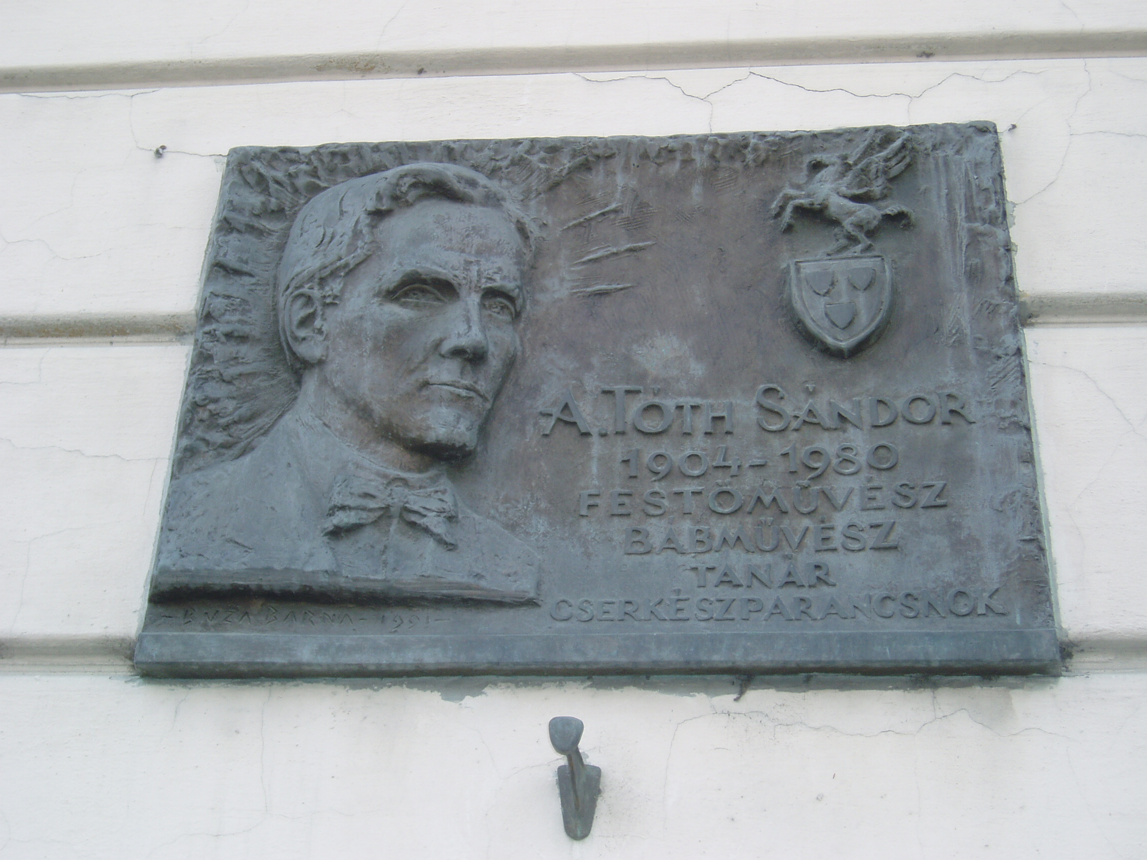 Nyilvános 1149 | 1868 | Pápa, Március 15. tér 9. Pápai Református Kollégium Gimnáziuma | A híres pápai Református Kollégium első épülete 1531 és 1752 között a mai Ruszek közben, a Lábasház épületének helyén állott. 1752-ben - Mária Terézia rendeletének következtében, amely megszüntette a szabad vallásgyakorlást - harminckét évig csak a közeli Adásztevelen működhetett. 1784-ben, II. József türelmi rendeletének köszönhetően térhetett vissza az iskola Pápára, s hamarosan felépült a ma Ókollégiumként ismert épület (lásd: Pápa, Petőfi u. 13.), amelyben 1794-ben indulhatott meg az oktatás. Az intézmény 1857-ig működött ott, ekkor átköltözött a Március 15. tér 13-15. számú házba, az ún. Nátus-ba, majd 1895-ben utolsó végleles helyére, ide, a Március 15. tér 9. számú monumentális új épületbe. A képen A. Tóth Sándor (1904-1980) emléktáblája látható, Búza Barna alkotása. A. Tóth Sándor az államosítás előtti években franciát, rajzot és ábrázoló geometriát tanított a gimnáziumban. Később a képzőművészeti főiskola tanára lett, és bábművészként is ismert volt. A fénykép 2007 áprilisában készült. Felh. irod.: Németh Adél - Szabó Lajos: Pápa. Bp. Panoráma, 1989 http://refi-papa.hu |