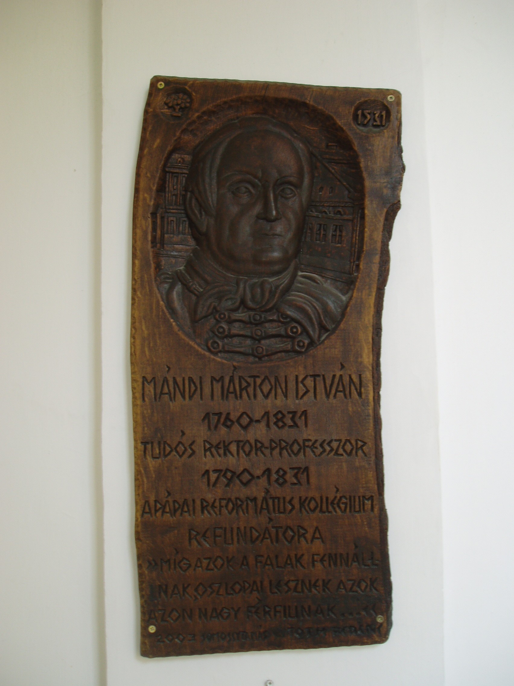 Nyilvános 1081 | 1743 | Pápa, Március 15. tér 9. Pápai Református Kollégium Gimnáziuma | A híres pápai Református Kollégium első épülete 1531 és 1752 között a mai Ruszek közben, a Lábasház épületének helyén állott. 1752-ben - Mária Terézia rendeletének következtében, amely megszüntette a szabad vallásgyakorlást - harminckét évig csak a közeli Adásztevelen működhetett. 1784-ben, II. József türelmi rendeletének köszönhetően térhetett vissza az iskola Pápára, s hamarosan felépült a ma Ókollégiumként ismert épület (lásd: Pápa, Petőfi u. 13.), amelyben 1794-ben indulhatott meg az oktatás. Az intézmény 1857-ig működött ott, ekkor átköltözött a Március 15. tér 13-15. számú házba, az ún. Nátus-ba, majd 1895-ben utolsó végleles helyére, ide, a Március 15. tér 9. számú monumentális új épületbe. Az iskola folyosóin számtalan emléktábla, szobor, dombormű idézi az egykori kiváló tanárok, jeles diákok alakját. A képen Mándi Márton István fa reliefje látható, amely Somosi Tamás munkája. Mándi Márton István (Iszkaszentgyörgy, 1760. nov. 23. – Pápa, 1831. szept. 21.) nyelvész, tanár, filozófus. Kecskeméten, Debrecenben, majd Göttingában tanult. 1790-től volt a pápai református gimnázium rektor-professzora. Nevéhez fűződik az iskola új fellendülése. A filozófiában Kant követője volt és 1795-ben már Kant tanítása alapján tartott előadásokat, amelyekért súlyos bírálat érte. Síremléke az Alsóvárosi temetőben van (lásd: Pápa, Alsóvárosi temető,: Mándi Márton István sírja); márvány mellszobra, Izsó Miklós alkotása a református könyvtárban látható. A fénykép 2007 áprilisában készült. Felh. irod.: Németh Adél - Szabó Lajos: Pápa. Bp. Panoráma, 1989 http://refi-papa.hu |
