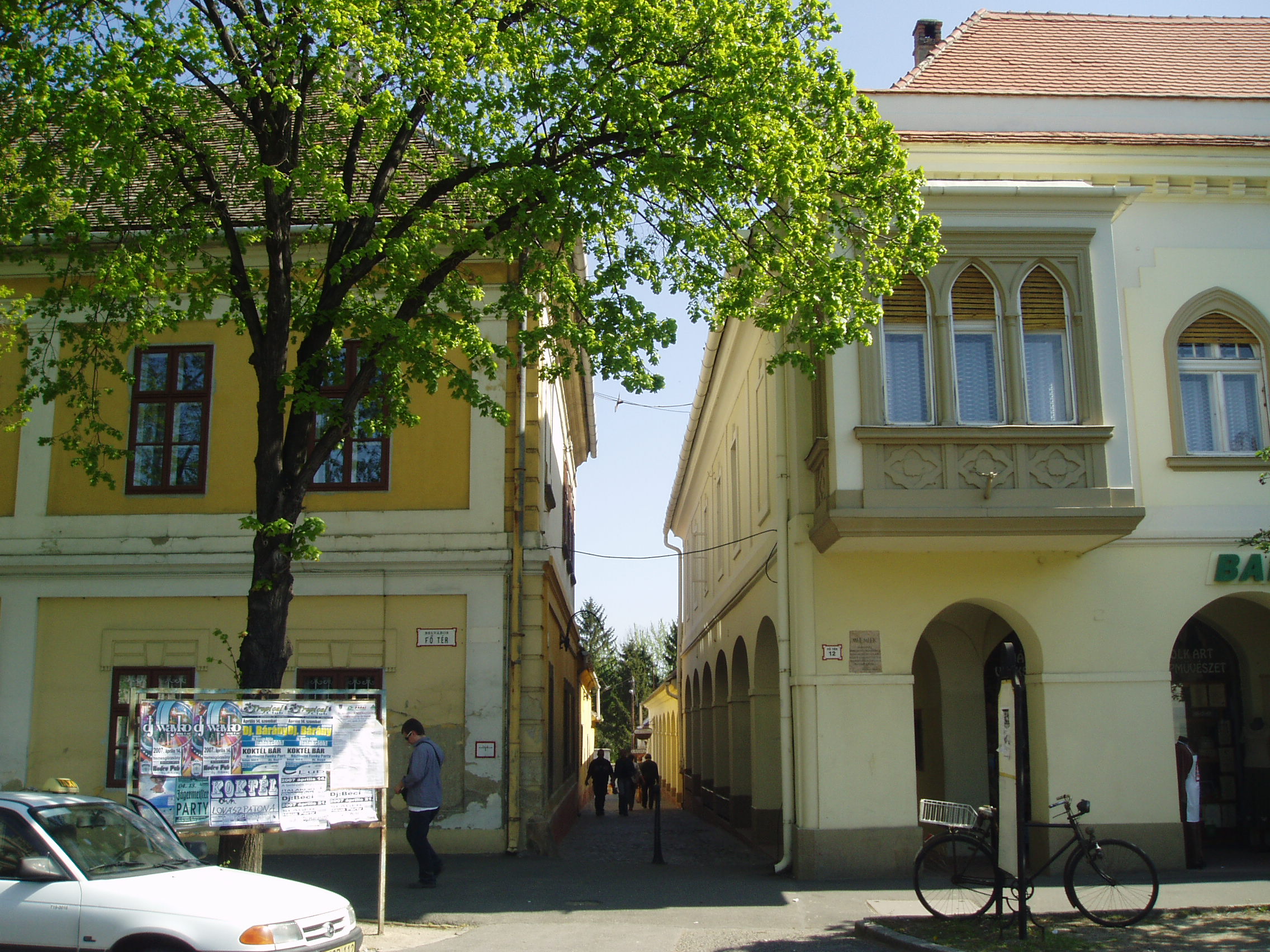 Nyilvános 1077 | 2212 | Pápa, Ruszek köz (a Fő tér felől) | A Fő tér 11. és 12. számú épületek között nyílik a Ruszek köz. A bal oldali, egyemeletes épület (Fő tér 11.) a római katolikus plébániaház. A XVI. századi eredetű épület mai, jellegzetesen barokk megjelenését a XVIII. században nyerte. Jobbra az ún. Lábasház (Fő tér 12.) látható. A XVIII. századi, barokk stílusú épületet a keskeny Ruszek köz felőli oldalon hosszanti és harántívekkel ritmusosan tagolt folyosó tesz egységes megjelenésűvé. Valaha élénk kereskedelmi élet folyt itt. Az épület Fő tér felőli homlokzata a XIX. században neogótikus külsőt kapott. A Lábasház helyén volt a híres református kollégium első épülete. Eredetileg katolikus iskola volt, amely 1531-ben alakult át a protestánsok tanintézetévé, majd egy hosszabb fejlődési idő alatt, 1585-ben főiskolábá vált. 1752-ig állt ezen a helyen. Mária Terézia rendeletére ekkor szüntették meg a reformátusok vallásgyakorlatát, s az iskolát a közeli Adásztevelre száműzték, ott működött harminckét évig. 1784-ben térhetett vissza Pápára, s hamarosan felépült új otthona (lásd: Pápa, Petőfi u. 13.). Besétálva a Ruszek közbe, a nagy múltú iskola emléktáblája a bal oldali épületen olvasható. A fénykép 2007 áprilisában készült. Felh. irod.: Németh Adél - Szabó Lajos: Pápa. Bp. Panoráma, 1989 |
