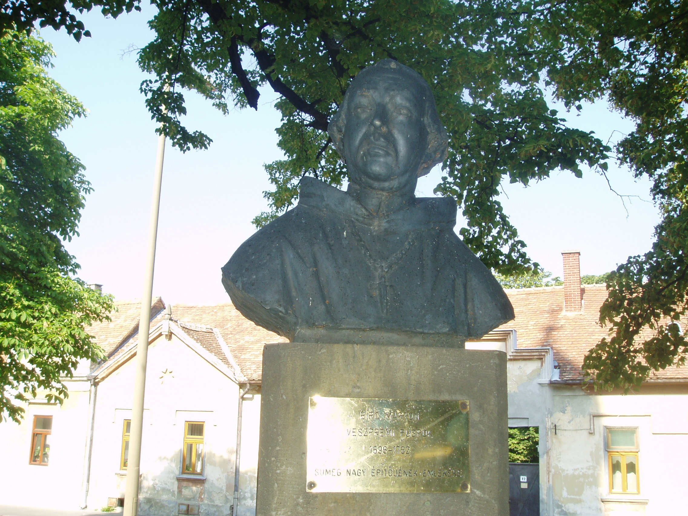 Nyilvános 1127 | 1703 | Sümeg, Bíró Márton utca 1. Plébániatemplom | Sümeg egyik legszebb épülete az Urunk mennybemenetele tiszteletére emelt római katolikus templom. Ezen a helyen már a XIV. században templom állott, melyet Padányi Bíró Márton lebontatott, és 1756-1759 között építtette fel a mai barokk plébániatemplomot. Építészetileg a barokk stílus általános, megszokott mintáit mutatja: nyugati főhomlokzatát hatalmas falpillérek díszítik, fölötte háromrészes főpárkány húzódik, a középrészben az építtető püspök címerével. Az épület igazi értékét Franz Anton Maulbertsch falfestményei jelentik, amelyek az egész templombelsőt beborítják. Nem véletlenül nevezik a templomot a rokokó Sixtus-kápolnájának. A templom előtti kis parkban állították fel az építtető püspök és a festőművész mellszobrait, mindkettő Marton László alkotása. A képen Padányi Bíró Márton püspök (1696-1762) szobra látható. A fénykép 2007 júniusában készült. Felh. irod.: Koppány Tibor - Kozák Károly: Sümeg útikalauz. Veszprém, Idegenforgalmi Hivatal, 1965 Látnivalók Veszprém megyében. Miskolc, Well-PRess, 2004 Sümegi kalauz. Sümeg, Sümegi Fórum Alapítvány, 1993 |