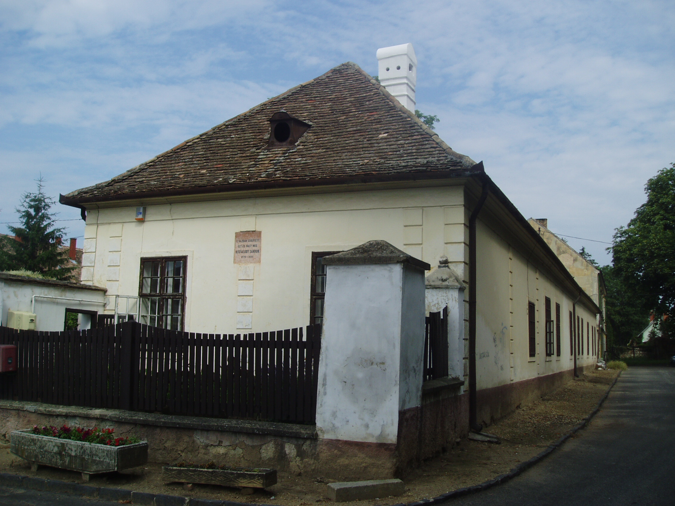 Nyilvános 1115 | 1829 | Sümeg, Kisfaludy tér 2. | Ebben a házban, amely ma a Városi Múzeum otthona, született és halt meg Kisfaludy Sándor. A XVII. században épült ház eredetileg a Sándorffy család tulajdona volt, a Kisfaludyakra örökség útján maradt. A XIX. században klasszicizáló stílusban többször is átépítették a boltíves barokk kúriát, ittlakása idején Kisfaludy Sándor is bővíttette. A költő 1772. szept. 27-én látta meg itt a napvilágot. Hat éves volt, amikor a család Tétre költözött (Károly öccse ott született 1788-ban). Eseménydús ifjúsága volt. 1793–1796 között a bécsi testőrség tagja. Részt vett a franciák elleni hadjáratban, fogságba is esett. 1799-ben leszerelt, a következő évben feleségül vette Szegedy Rózát. A házaspár Ötvös-pusztán, majd Kámban lakott. Sümegre 1805-ben pedig költöztek, itt éltek halálukig. Miután 1832-ben elveszítette szeretett feleségét, az idős költő újra megnősült, azonban második felesége, Vajda Amália is hamarosan meghalt. Ő maga itt, otthonában hunyt el 1844. október 28-án. Sírja a sümegi temetőben van (lásd: Sümeg, Temető). Kisfaludynak volt még egy ingatlana Sümegen, egy ma is álló présház (Sümeg, Külterület XI. 200). Sok időt töltött ott is, s ott vetette papírra az inszurrekció kudarcos történetét. A házat emléktábla jelöli, mellette áll Kisfaludy tölgyfája, amelyet a hagyomány szerint a költő ültetett (sajnos, fénykép nincs róla, nem találtam meg, amikor Sümegen jártam - K. K.) A fénykép 2007 júniusában készült. Felh. irod.: Koppány Tibor - Kozák Károly: Sümeg útikalauz. Veszprém, Idegenforgalmi Hivatal, 1965 Sümegi kalauz. Sümeg, Sümegi Fórum alapítvány, 1993 Kisfaludy Sándor. Veszprém, Veszprém Megyei Múzeumi Igazgatóság. /Pannon Panteon 1./ |