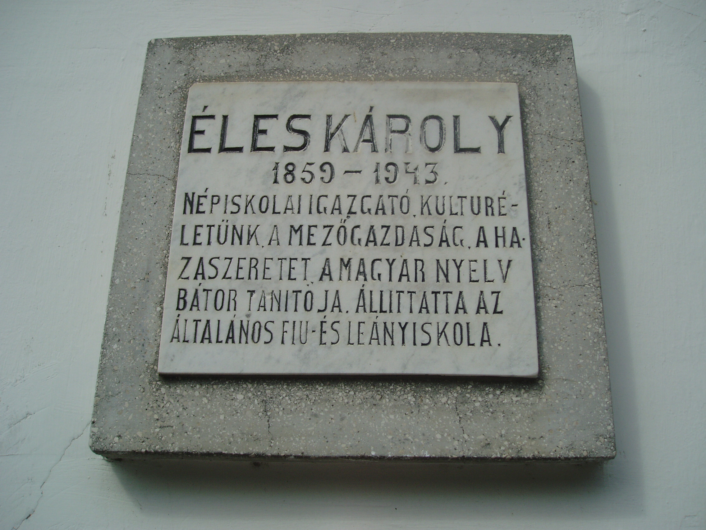 Nyilvános 1111 | 1733 | Sümeg, Panteonfal. Éles Károly emléktáblája | A Kisfaludy téren, Kisfaludy Sándor szülőháza előtt alakították ki Sümeg Panteonfalát. A képen Éles Károly emléktáblája látható (1955). Felirata: ÉLES KÁROLY 1859-1943. Népiskolai igazgató, kulturéletünk, a mezőgazgdaság, a hazaszeretet, a magyar nyelv bátor tanítója. Állíttatta az Általános Fiu- és Leányiskola. Éles Károly (Sümeg, 1859. dec. 16. – Sümeg, 1943. máj.) tanító. Eredeti családneve Scharf. Csurgón szerzett tanítói oklevelet, 1878–1883 között Sümegen tanított, majd Perkátán és Pakson dolgozott. 1888-ban visszatért szülővárosába. Az elemi iskola tanítója, 1916-tól igazgatója. Pedagógiai szakírói tevékenysége mellett etnográfiai és helytörténeti kutatásokat is végzett. Szerkesztője volt a Sümeg–Szent-Gróth, majd a Sümeg és Vidéke című lapoknak. A fénykép 2007 júniusában készült. Felh. irod.: Koppány Tibor - Kozák Károly: Sümeg útikalauz. Veszprém, Idegenforgalmi Hivatal, 1965 Látnivalók Veszprém megyében. Miskolc, Well-PRess, 2004 Veszprém megyei életrajzi lexikon. Veszprém, Veszprém Megyei Önkormányzat Közgyűlése, 1998 www.ekmk.hu/emlekhely/Emlekhelyek.html |