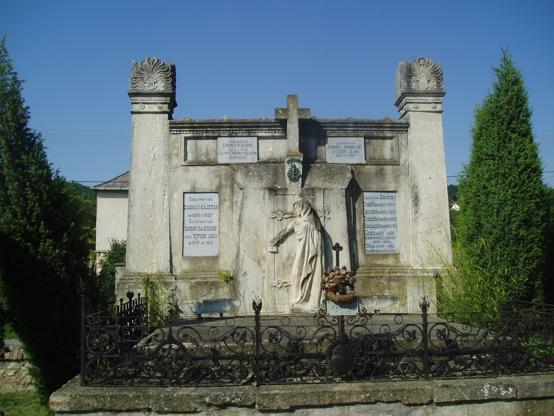 Nyilvános 1153 | 2708 | Sümeg, Temető. Darnay Kálmán sírja | Sümeg délkeleti határában, a Tapolcára vezető út mellett emelkedő lankás domboldalon találjuk a város köztemetőjét. Helyét még Bíró Márton püspök jelölte ki; jelentősebb számban a XIX. század eleje óta kezdtek ide temetkezni. A temetődomb tetején áll az 1816-ban épített, későbarokk stílusú temetőkápolna. Körülötte a sümegi élet utolsó két évszázada szinte valamennyi híres személyiségének sírja fellelhető. Magas kőalapra épített, díszes kovácsoltvassal kerített sírkert a szentmártoni Darnay család temetkezési helye. Itt nyugszik Darnay Kálmán (1864-1945) múzeumalapító, régész, író, aki hosszú évtizedeken át Sümeg társadalmi és kulturális életének egyik legjelentősebb képviselője volt. Darnayt sokat foglalkoztatta Kisfaludy Sándor élete. Közreműködött levelezése kiadásában, múzeumában gazdag gyűjteményt hozott össze a költőre vonatkozó dokumentumokból. 1897-ben a Nemzeti Múzeumnak ajándékozta Kisfaludy Sándor 3600 kötetes könyvtárát. Két regényének is a költő élete a témája (Testőrszerelmek, Elkésett csók). A bujdosó gyöngysor c. munkájában a Balaton- és a Bakony-vidéki várak történetének regényes feldolgozását, a Kaszinózó táblabírákban pedig szülőföldje anekdotáit gyűjtötte csokorba. A család síremlékét Istók János szobrászművész készítette. Az ő alkotása a nőalakot ábrázoló dombormű is. A fénykép 2007 júniusában készült. Felh. irod.: Koppány Tibor - Kozák Károly: Sümeg útikalauz. Veszprém, Idegenforgalmi Hivatal, 1965 Sümegi kalauz. Sümeg, Sümegi Fórum Alapítvány, 1993 Miklósi-Sikes Csaba: Kőbe vésett történelem. A sümegi városi temetők története és sírjelei 1950-ig. Sümeg, Sümegi Fórum Alapítvány, 2002 Veszprém megyei életrajzi lexikon. Veszprém, Veszprém Megyei Önkormányzat Közgyűlése, 1998 |