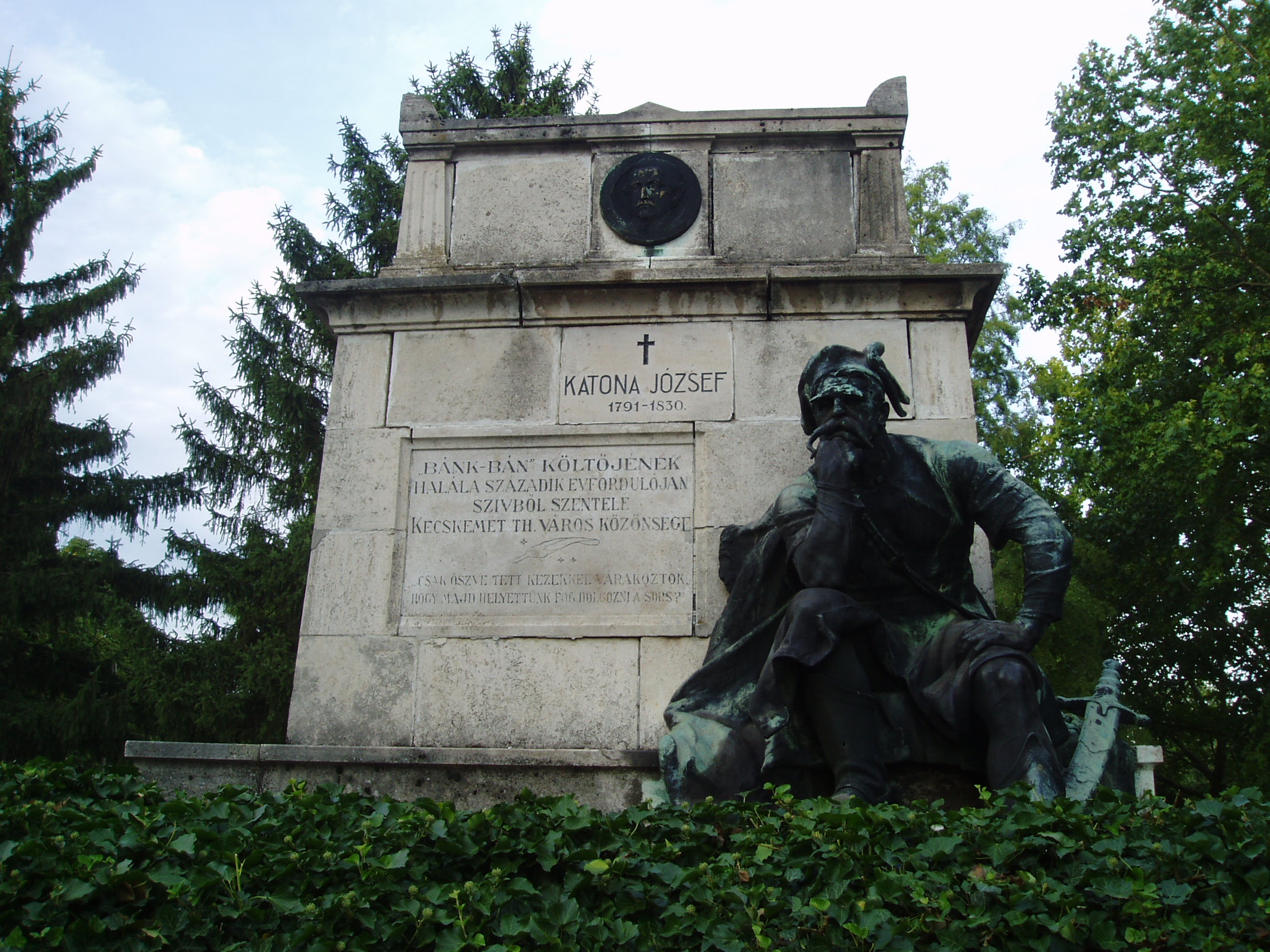 Nyilvános 1284 | 2456 | Kecskemét, Béke fasor 71A. Köztemető: Katona József sírja | Az 1960-as években kialakított, nyárfákkal szegélyezett Béke fasor vezet Kecskemét Köztemetőjébe. Már a bejárattól jól látható Katona József hatalmas síremléke. Katona József 1830. április 16-án Kecskeméten hunyt el (lásd: Bács-Kiskun megye: Kecskemét, Kossuth tér). Ez a mostani már a harmadik nyughelye, Hamvait 1963-ban szállították ide egy felszámolásra ítélt temetőből. Monumentális síremléke még 1930-ban, halálának 100. évfordulója alkalmából készült. A klasszicizáló szarkofágot kőtömbre helyezték egy borostyánnal befuttatott egyméteres kiemelkedésen. A körbefutó hármas lépcsőn Petur bán bronzalakja áll. Az alkotó eredeti terveiben Tiborcot kívánta megjeleníteni az emlékművön, de az akkori várospolitikusok inkább a nemes Petur mellett döntöttek... A fénykép 2006 augusztusában készült. Felh. irod.: Heltai Nándor: Kecskemét. Kecskeméti Lapok, 1998 |