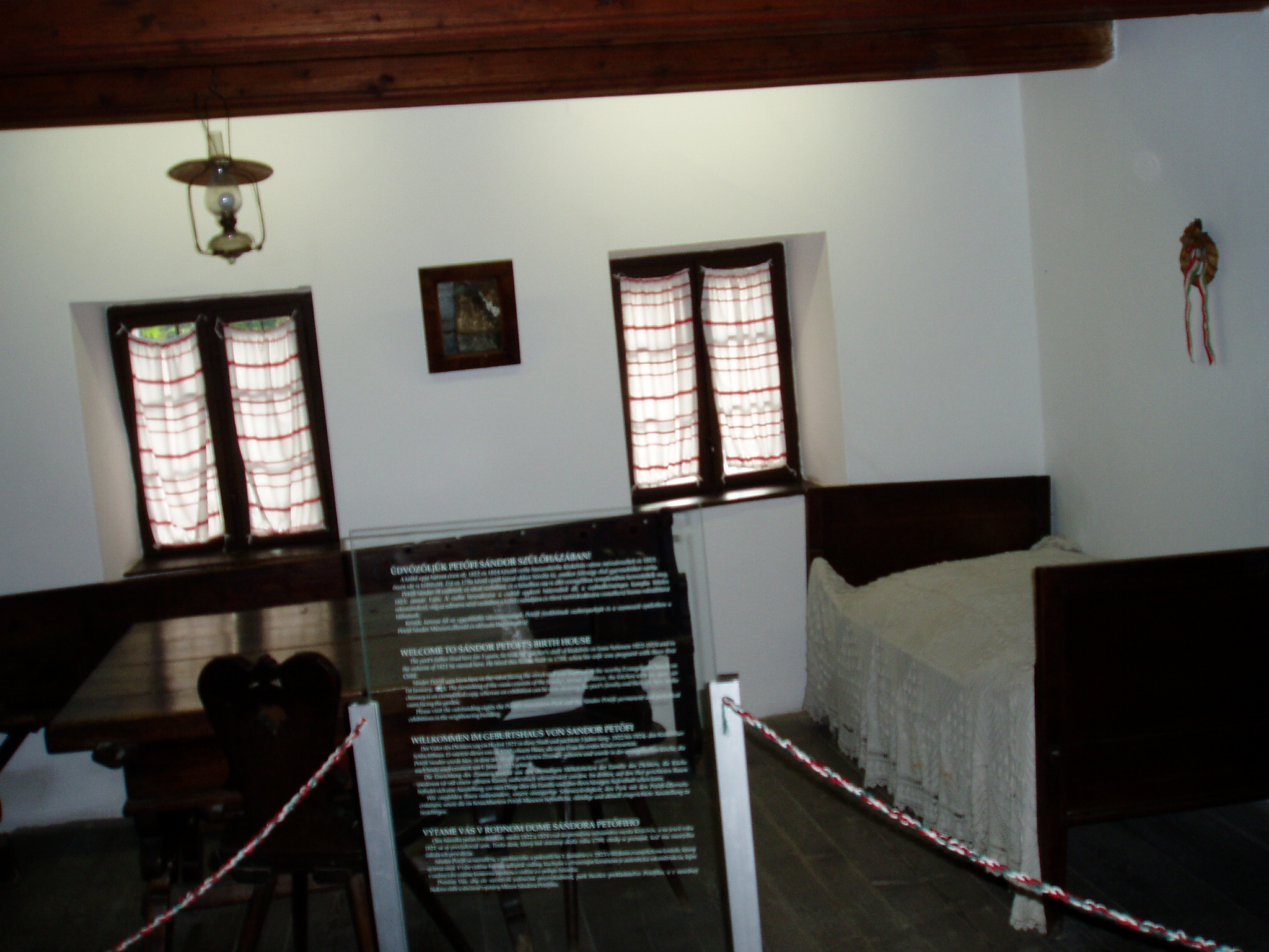 Nyilvános 1185 | 2410 | Kiskőrös, Petőfi tér 5. Petőfi Sándor szülőháza | A népi stílusú lakóház 1790 körül épült. A nádfedeles, deszkaoromzatú, már nem új házat Petrovics István hentes és mészáros 1821-ben vette bérbe, s felesége, Hrúz Mária itt szülte első gyermeküket, Sándort. Az 1790 körül épült zsellérházban kapott helyet a Petőfi Emlékmúzeum. A ház homlokzati márványtábláján ez olvasható: "Itt született Petőfi 1822. december 31-én". A bejárati ajtó szemöldökfája felett a költő sorait olvashatjuk: "Szent a küszöb, melyen beléptem én, / Oh szent a szalma kunyhók küszöbe. / Mert itt születnek a nagyok, az ég / A megváltókat ide küldi be." A ház konyhájában korabeli használati tárgyak láthatók. Az utcai szoba a Petrovics család bútoraival és egykori használati tárgyaival emlékeztet arra, hogy ott született a nemzet nagy költője. A képen látható ágyat az elszegényedett Petrovics család annakidején Dömösön eladta más bútorokkal együtt, s 1890-ben a Magyar Írók és Művészek Társasága kutatta fel és vásárolta meg. A fénykép 2004 októberében készült. Felh. irod.: Látnivalók Bács-Kiskun megyében. /Vendégváró/. Well-Press Kiadó, 2002. Petőfi emlékhelyek a Kárpát-medencében. Kiskőrös, Petőfi Sándor Társaság, 1996 |