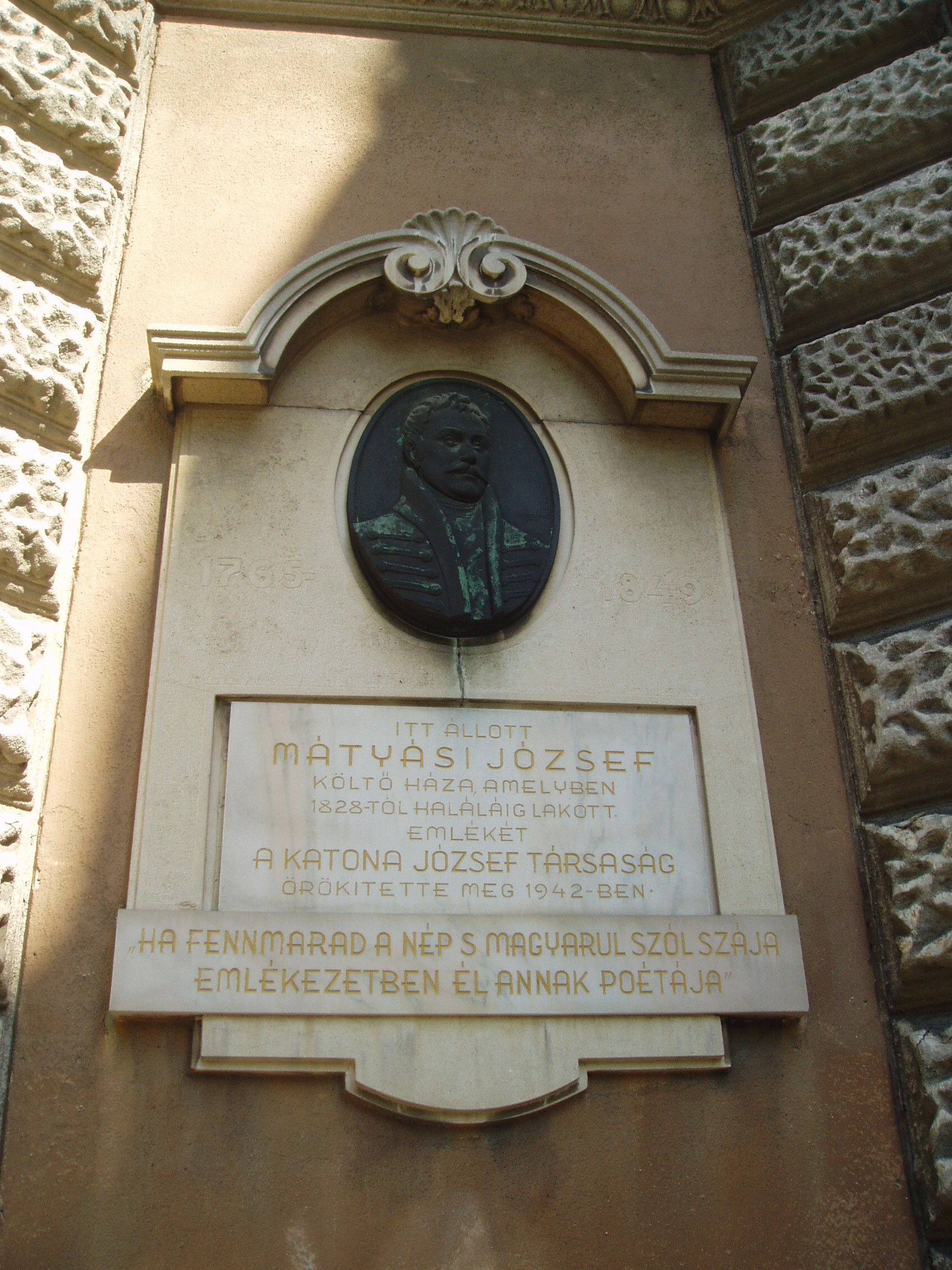 Nyilvános 1198 | 1856 | Kecskemét, Rákóczi út 7. | A bíróság épületének a keresztutca felőli részén egykor Mátyási József költő (1765-1849) "viskói uradalma" állt. Beigazolódott jövendölését vésték az őt idéző márványtáblára: "Ha fennmarad a nép s magyarul szól szája, emlékezetében él annak poétája." 1795-ben ezen a helyen Mátyási Józsefet meglátogatta Csokonai Vitéz Mihály, aki így méltatta az izsáki születésű költőt: Ezért is sok hálát nyer tőlem Kecskemét, Hogy kinek eddig is tiszteltem érdemét, Mátyási barátom s bátyám Apollóba! Veled ő állított legelőször szóba. Az ügyvédi képzettségű Mátyási József Teleki József gróf és Galánthai Fekete János generális titkáraként ismerkedett meg a francia felvilágosodás nagyjainak műveivel és fogadta el eszméiket. Joggal tartják az első felvilágosult magyar polgárnak. Már életében több kötete jelent meg, irodalmi munkásságáért Kecskemét magisztrátusa polgárjoggal, adómentességgel tisztelte meg. Sírja a városi köztemetőben van (lásd: Kecskemét, Béke fasor 71A). A fénykép 2006 augusztusában készült. Felh. irod.: Heltai Nándor: Kecskemét. Kecskeméti Lapok, 1998 |
