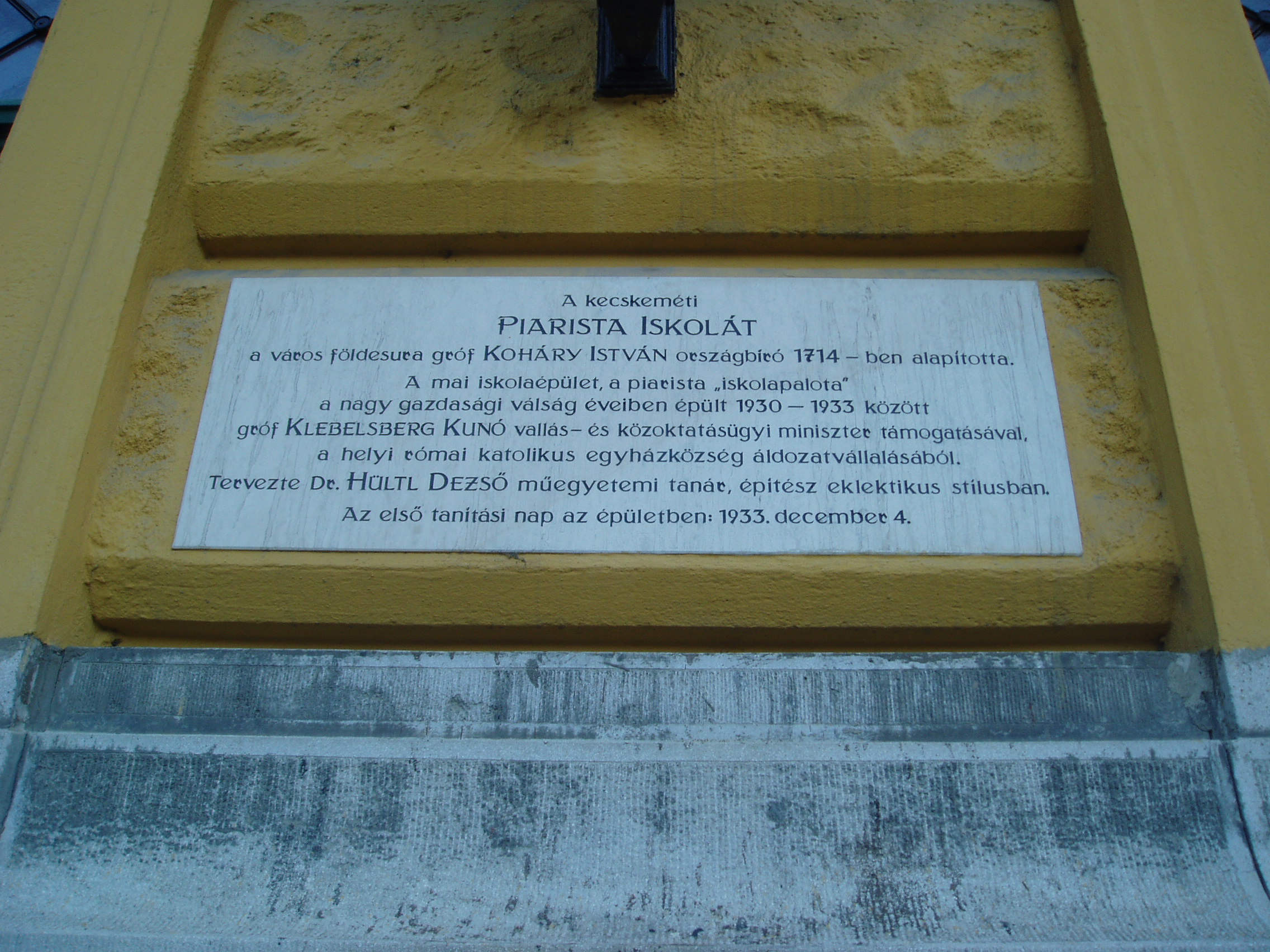 Nyilvános 1130 | 1839 | Kecskemét, Piaristák tere 5. | A mai Piarista Gimnázium és Általános Iskola a nagy múltú régi iskola (lásd: Kecskemét, Jókai u. 1.) közelében 1930 körül épült Hütl Dezső tervei alapján a hajdani főreáliskola helyére. A klasszicizáló huszártoronnyal díszített kétemeletes, monumentális iskolaépület homlokzati frontján Bory Jenő allegorikus szobrai láthatók. Mindkettőnek Kalazanci Szent József a főalakja. A fénykép 2006 augusztusában készült. Felh. irod.: Heltai Nándor: Kecskemét. Kecskeméti Lapok, 1998 |