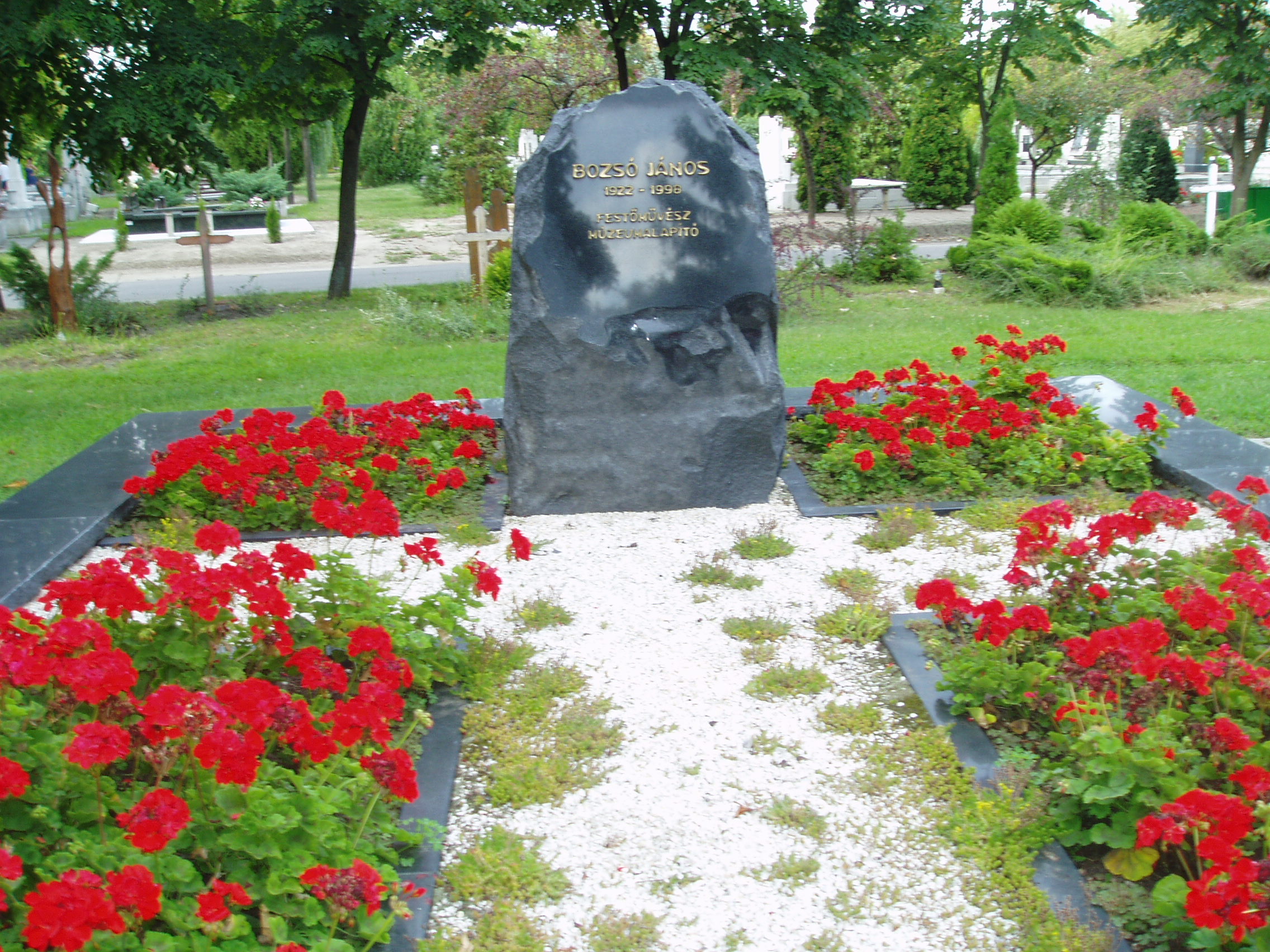 Nyilvános 1528 | 2290 | Kecskemét, Béke fasor 71/A Köztemető: Bozsó János sírja | Az 1960-as években kialakított, nyárfákkal szegélyezett Béke fasor vezet Kecskemét Köztemetőjébe. Már a bejárattól jól látható Katona József hatalmas síremléke, melynek közelében alakították ki a díszsírhelyeket, ahol a város jeles polgárai nyugszanak. Itt van a sírja Bozsó János (1922-1998) festőművésznek is. Az autodidakta festő népművészeti tárgyak gyűjtőjeként fordult az alföldi festészet felé, amelynek elismert művelője lett. Műtárgyaiból magánmúzeumot alapított, amelyet 1976-ban felajánlott Kecskemét városának. A sok ezer darabból álló Bozsó gyűjtemény 1979-ben nyílt meg a nagyközönség előtt, s a festőművész egykori lakóházában látogatható (lásd: Kecskemét, Klapka u. 14.). A fénykép 2006 augusztusában készült. Felh. irod.: Heltai Nándor: Kecskemét. Kecskeméti Lapok, 1998 www.artportal.hu |