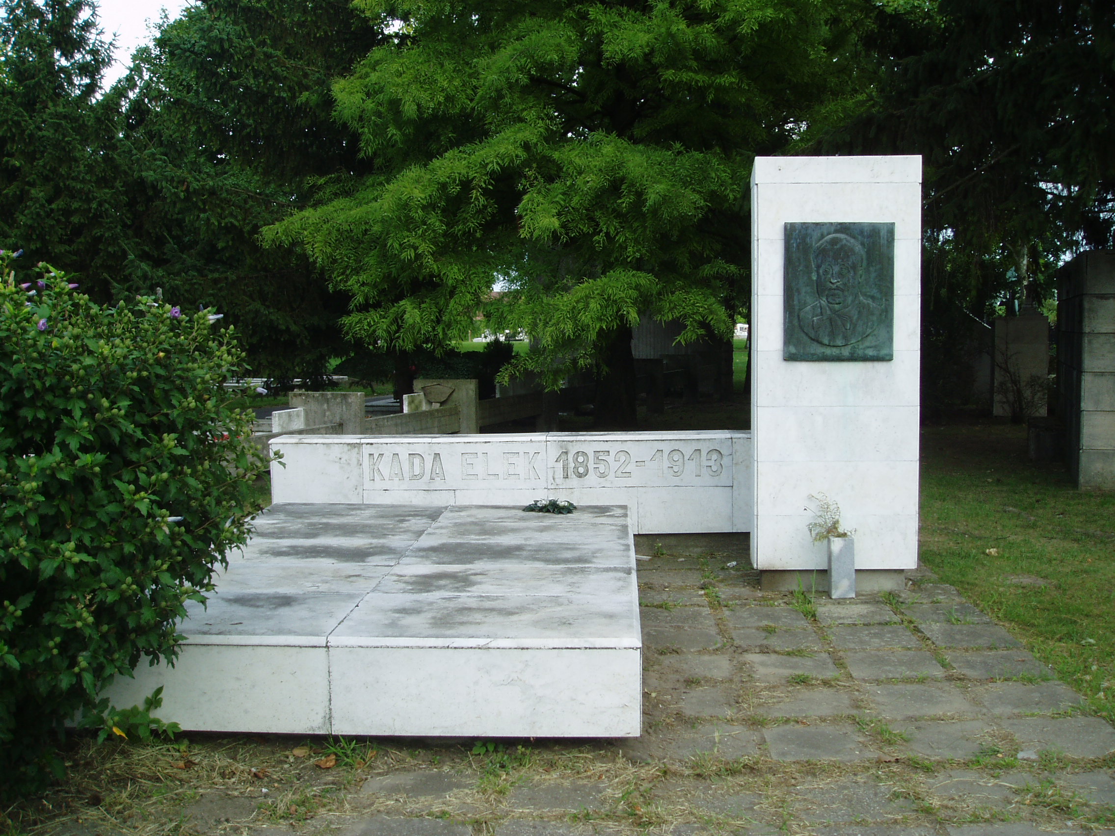 Nyilvános 1151 | 1885 | Kecskemét, Béke fasor 71/A Köztemető: Kada Elek sírja | Az 1960-as években kialakított, nyárfákkal szegélyezett Béke fasor vezet Kecskemét Köztemetőjébe. Már a bejárattól jól látható Katona József hatalmas síremléke, melynek közelében alakították ki a díszsírhelyeket, ahol a város jeles polgárai nyugszanak. Itt nyugszik Kada Elek (1852-1913), Kecskemét történelmének egyik legkiemelkedőbb polgármestere, függetlenségi párti országgyűlési képviselő. 1887-ben választották meg polgármesternek. Hivatali idejében a város addig soha nem látott fejlődésnek indult. Ő kezdeményezte Kecskemét és környékének régészeti feltárását is, s az előkerült leletekből létrehozta a városi múzeumot. Regényeket és színműveket is írt. A fénykép 2006 augusztusában készült. Felh. irod.: Heltai Nándor: Kecskemét. Kecskeméti Lapok, 1998 Székelyné Körösi Ilona: Kecskeméti évszázadok. Fejezetek a város múltjából. Kecskemét, Kecskeméti Lapok, 2003 |