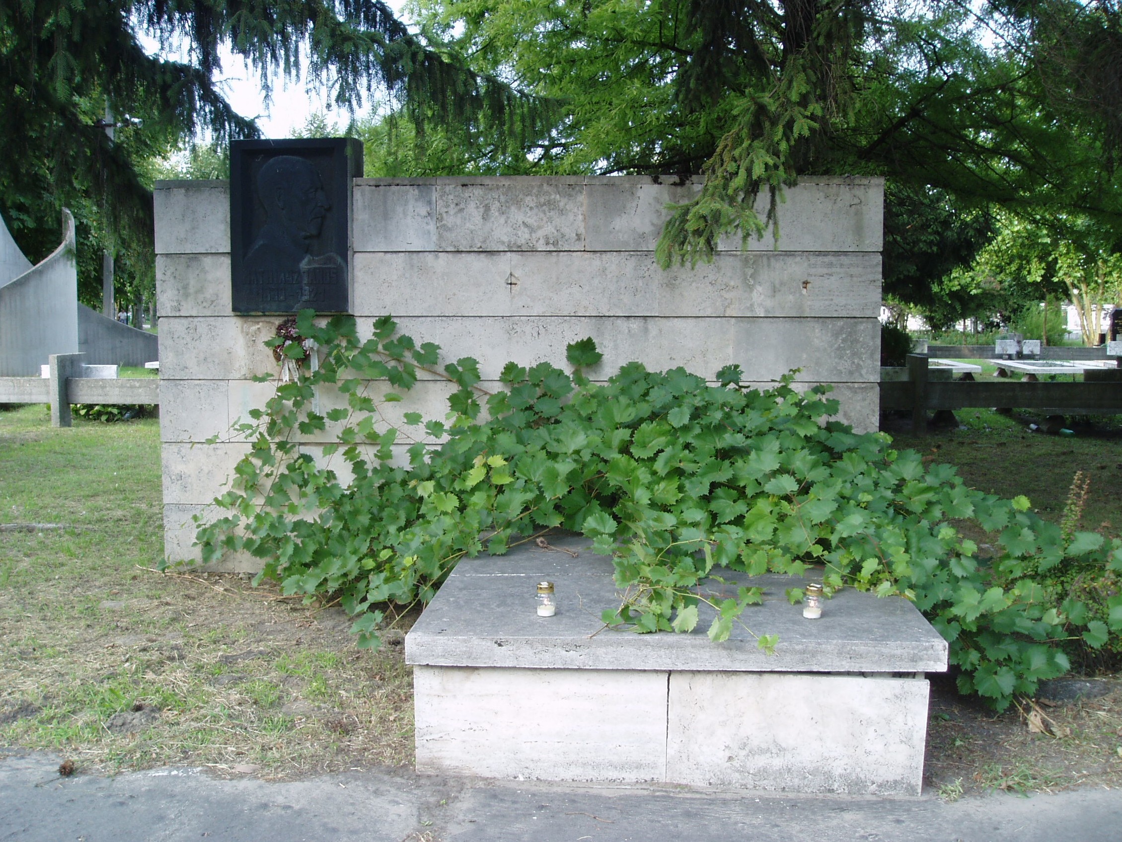 Nyilvános 1171 | 2152 | Kecskemét, Béke fasor 71/A Köztemető: Lestár Péter sírja | Az 1960-as években kialakított, nyárfákkal szegélyezett Béke fasor vezet Kecskemét Köztemetőjébe. Már a bejárattól jól látható Katona József hatalmas síremléke, melynek közelében alakították ki a díszsírhelyeket, ahol a város jeles polgárai nyugszanak. Itt nyugszik Mathiász János (1838-1921) szőlőnemesítő, számos új szőlőfajta létrehozója. A tokajhegyaljai származású mezőgazdász 1890-ben jött Kecskemétre, a környéken vásárolt birtokot. Hatalmas munkát végzett: élete során mintegy 3500 hibridet állított elő, ezek közül 180-nak részletes fajta-leírását is elvégezte. Az új fajtáknak olyan „költői” neveket adott, mint például Erzsébet királyné emléke, Kecskemét gyöngye, Kecskemét kincse, Cegléd szépe, Mathiász János diadala, de szerepelnek a névadók között a magyar irodalom és történelem nagyjai is: Vörösmarty Mihály, Zrínyi Ilona, Tompa Mihály, Bem tábornok. Ma is 67, névvel ellátott fajtáját tartják számon, melyek közül 12-t világszerte ismernek, termesztenek. A két legismertebb, általa nemesített fajta a Csabagyöngye és a Szőlőskertek királynője. Jórészt neki köszönhető, hogy a magyar – főként a homoki – csemegeszőlő-termelés magas színvonalra emelkedett. Számos korabeli író, költő emlékezett meg a nagy borászról-szőlészről. Barátja volt Arany János, Ady Endre és Vikár Béla költő is. Kecskemét környéki birtoka a diplomáciai, politikai és honvédelmi elit találkozóhelye volt: járt nála Ferenc József és Erzsébet királyné is. "Mathiász János olyan a szőlészetben, borászatban, mint Petőfi a költészetben" - írta Arany János, míg Ady Endre ekképpen fogalmazott munkája kapcsán: "E kertek a csodák kertjei". Németh Lászlóra is nagy hatással volt Mathiász János munkássága; egyik drámájának helyszínét is róla nevezte el (Mathiász panzió). A fénykép 2006 augusztusában készült. Felh. irod.: Heltai Nándor: Kecskemét. Kecskeméti Lapok, 1998 Magyar életrajzi lexikon Elkótyavetyélt védjegy vagy világhírű hungaricum? = Menedzsment Fórum 2006. júl. 12. |
