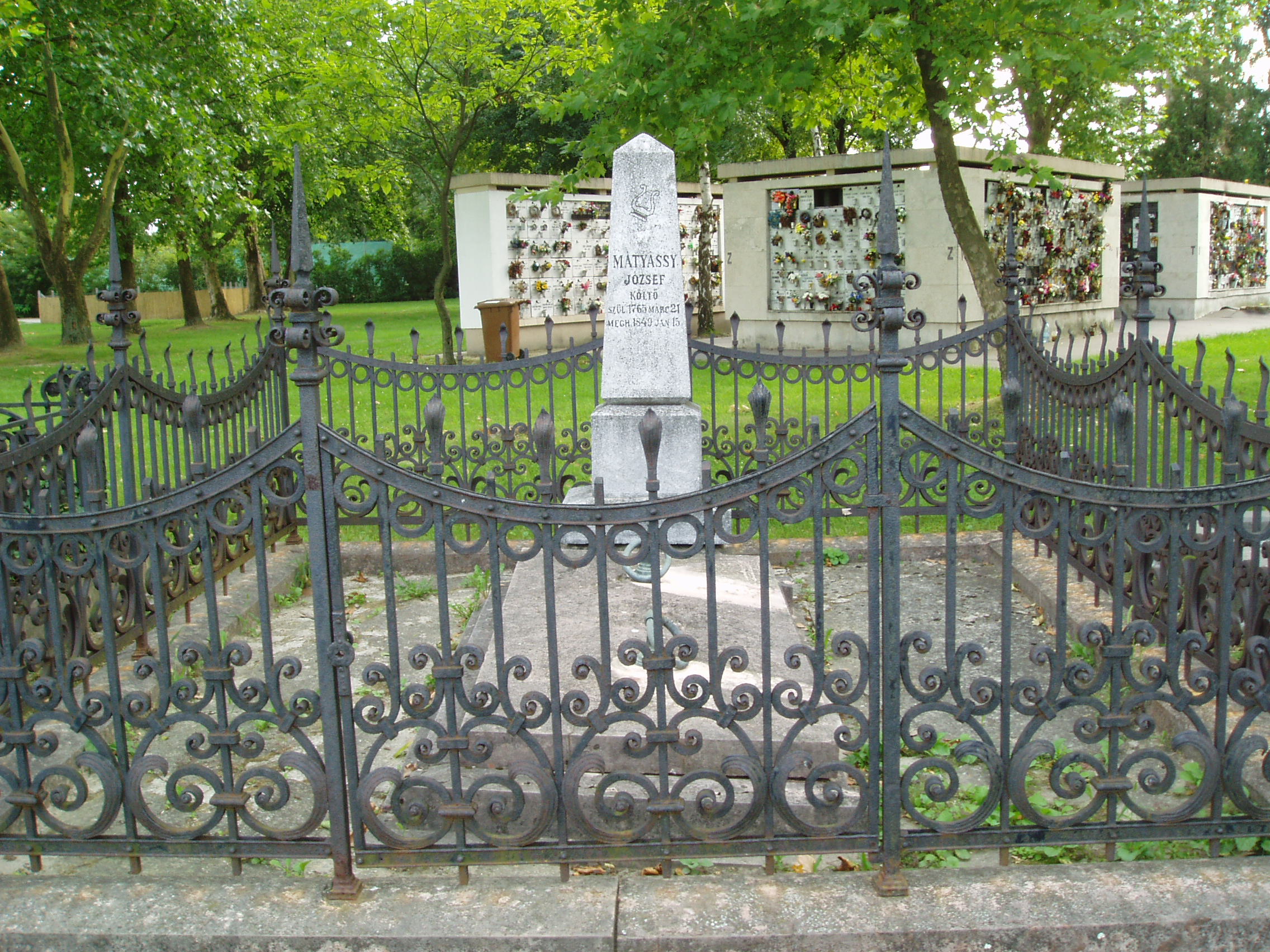 Nyilvános 1505 | 2316 | Kecskemét, Béke fasor 71/A Köztemető: Mátyási József sírja | Az 1960-as években kialakított, nyárfákkal szegélyezett Béke fasor vezet Kecskemét Köztemetőjébe. Már a bejárattól jól látható Katona József hatalmas síremléke, melynek közelében alakították ki a díszsírhelyeket, ahol a város jeles polgárai nyugszanak. Itt nyugszik Mátyási József (1765-1849) költő. Az ügyvédi képzettségű Mátyási József Teleki József gróf és Galánthai Fekete János generális titkáraként ismerkedett meg a francia felvilágosodás nagyjainak műveivel és fogadta el eszméiket. Joggal tartják az első felvilágosult magyar polgárnak. Már életében több kötete jelent meg, irodalmi munkásságáért Kecskemét magisztrátusa polgárjoggal, adómentességgel tisztelte meg. Egykori lakóházának utódépületét is emléktábla jelöli a városban (lásd: Kecskemét, Rákóczi út 7.). A fénykép 2006 augusztusában készült. Felh. irod.: Heltai Nándor: Kecskemét. Kecskeméti Lapok, 1998 Magyar életrajzi lexikon |