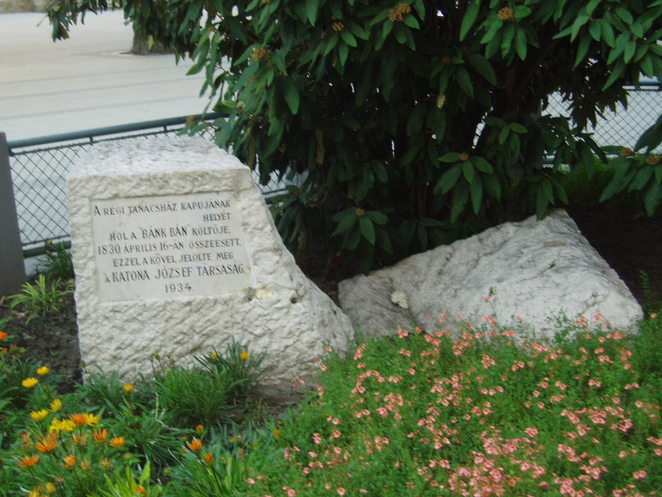 Nyilvános 1165 | 1809 | Kecskemét, Kossuth tér 1. | A szecessziós stílusú városháza 1892-1896 között épült Lechner Ödön és Pártos Gyula tervei szerint. Helyén egykor a régi városháza állott, ott dolgozott Katona József, mint városi ügyész, majd főügyész. Egy zsúfolt délelőtt után, miután megebédelt, egy kollégájával beszélgetve visszafelé tartott hivatalába, amikor a belső folyosón összeesett és szívszélhűdésben elhunyt. Halálának helyén, amely a mai épület előtt található, emlékkövet helyeztek el 1934-ben a következő szöveggel: "Itt hasadt meg a szíve Kecskemét legnagyobb fiának". A fénykép 2006 augusztusában készült. Felh. irod.: Heltai Nándor: Kecskemét. Kecskeméti Lapok, 1998 |
