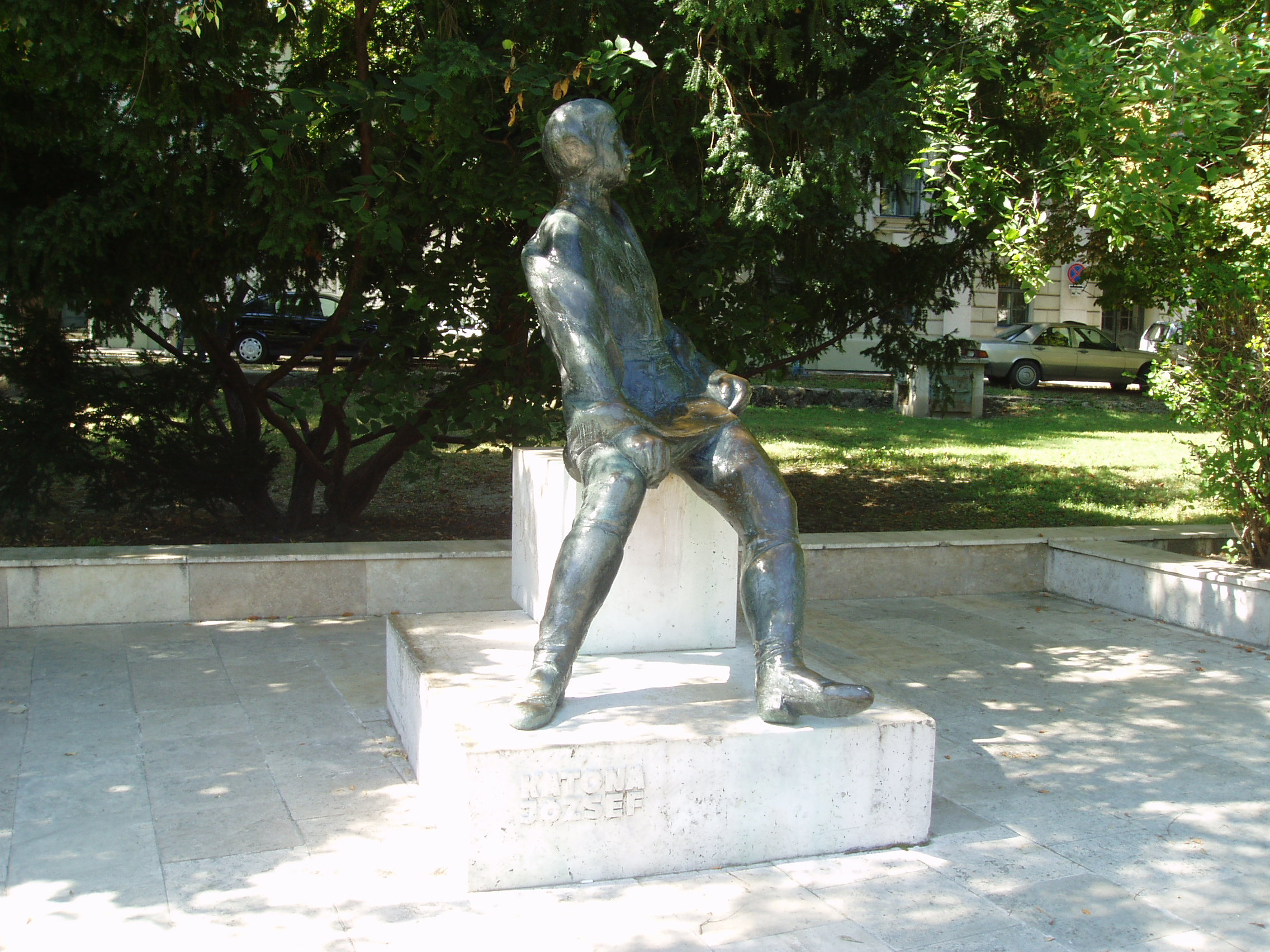 Nyilvános 1089 | 1697 | Kecskemét, Katona József tér 05. Katona József emlékműve | A Katona József Színház mögött 1962. december 16-án Kodály Zoltán avatta fel Vigh Tamás szobrászművész alkotását, Illyés Gyula jelenlétében. Ezen a napon ünnepelte meg szülővárosa Kodály 80. születésnapját, s este a színházban rendezett díszhangversenyen Illyés Gyula maga olvasta fel a Bevezetés egy Kodály-hangversenyhez című versét. A fénykép 2006 augusztusában készült. Felh. irod.: Heltai Nándor: Kecskemét. Kecskeméti Lapok, 1998 Bács-Kiskun megyei történeti és kegyeleti emlékhelyek számbavétele. Kecskemét, 1989 |