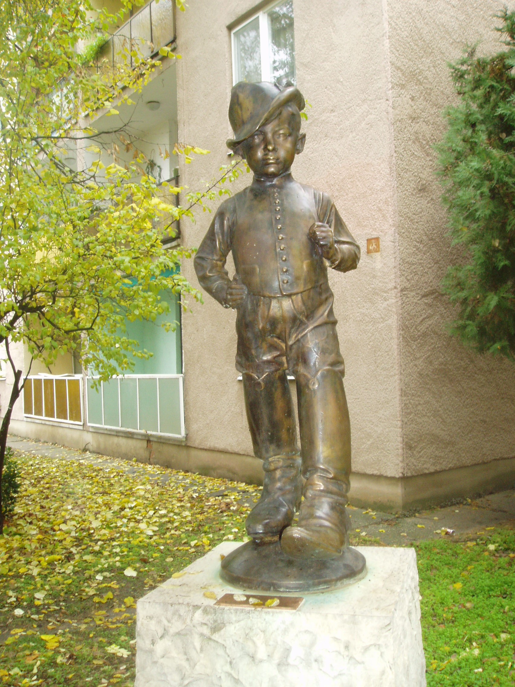 Nyilvános 1162 | 2089 | Baja, Kölcsey utca 45. Hüvelyk Matyi szobra | A József Attila lakótelepen, a Kölcsey utca 45. számú épület előtt áll Telcs Ede: Hüvelyk Matyi című kedves szobra. A kecskeméti Katona József Könyvtár honlapján közzétett "Történelmi és kegyeleti emlékhelyek" című összeállítás szerint a szobor csak másolat, eredeti példányát a Türr István Múzeum őrzi. Alkotója, Telcs Ede Baján született 1872-ben (lásd: Baja, Táncsics M. u. 28.). A fénykép 2007 októberében készült. |