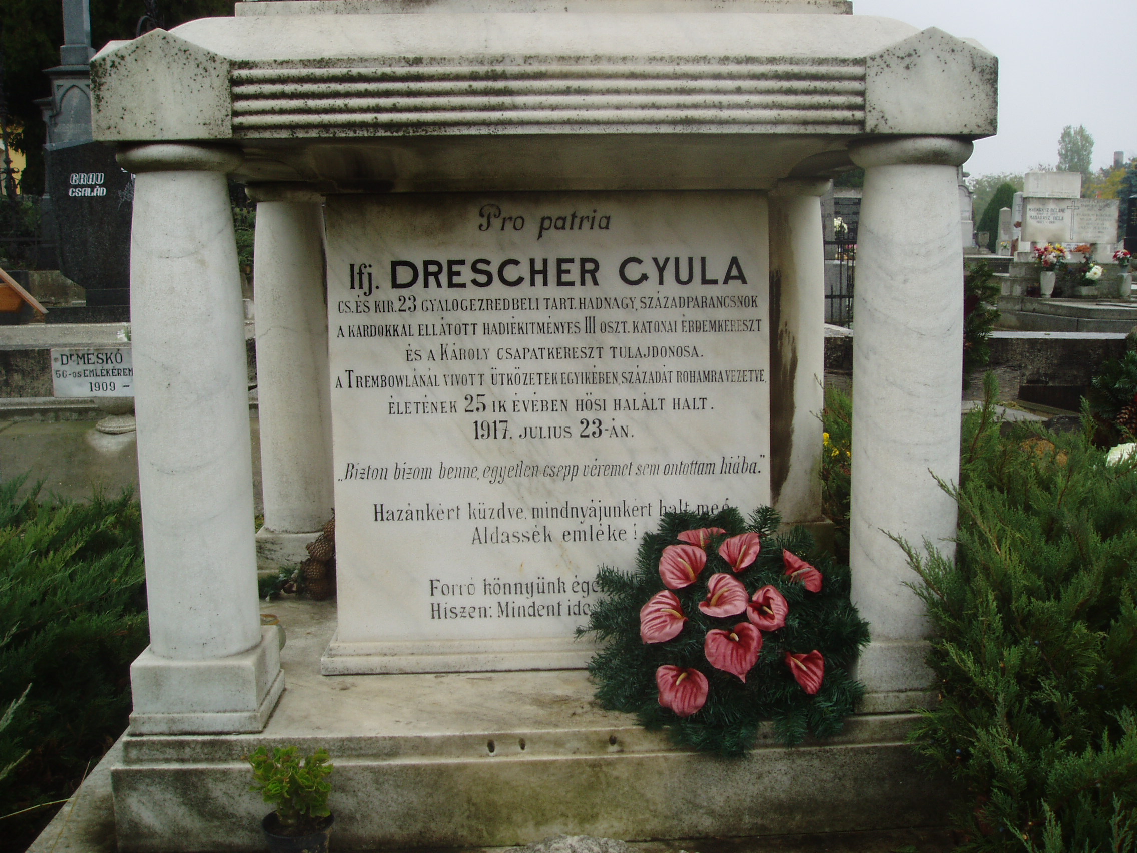 Nyilvános 1110 | 2162 | Baja, Rókus utva: Rókus temető - Drescher Gyula sírja | Itt nyugszik ifj. Drescher Gyula, a 23. gyalogezred tartalékos hadnagya, századparancsnok. Hősi halált halt életének 25. évében, 1917. november 23-án. A fénykép 2007 októberében készült. |