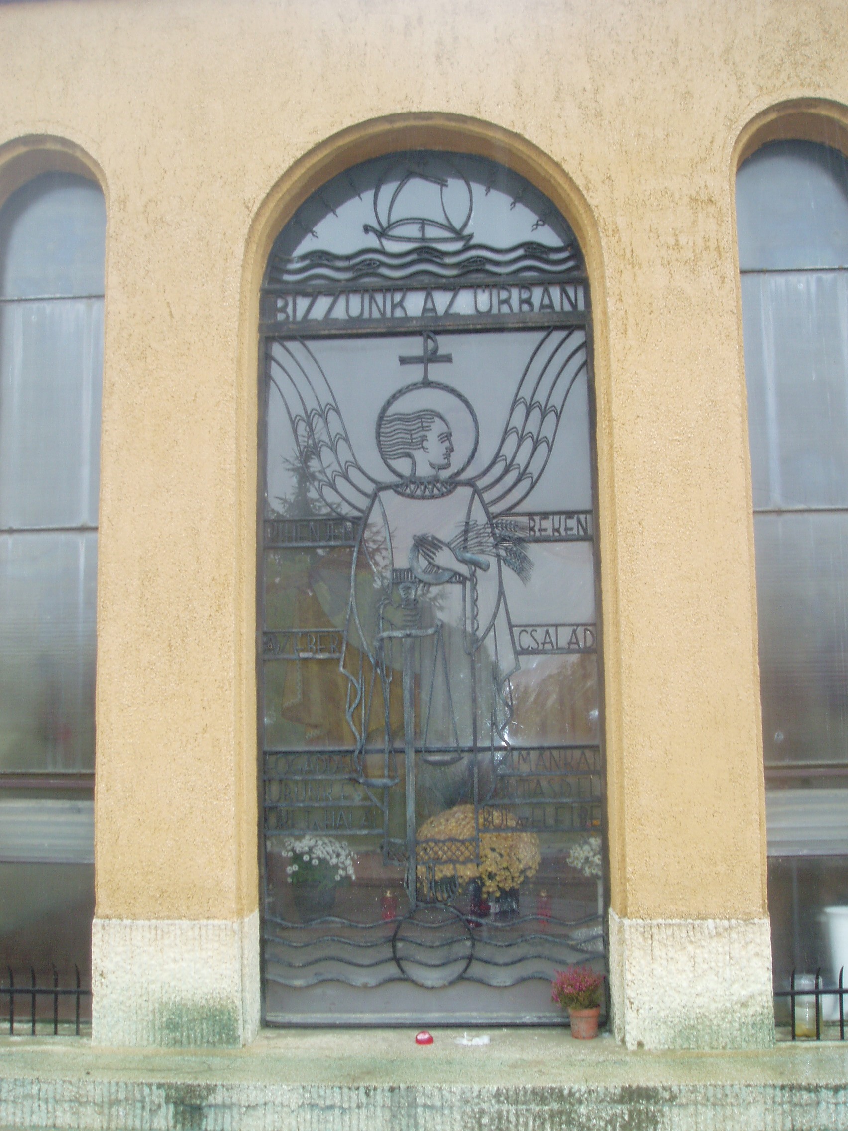 Nyilvános 1132 | 1905 | Baja, Rókus utca: Rókus temető: az Éber család kriptája | A temetőkápolna közelében áll az Éber család kriptája. Más családtagok körében itt nyugszik Éber Sándor (1878-1947) festőművész, fia, ifj. Éber Sándor 1909-1985) és leánya, az 1905-ben született és közelmúltban elhunyt (pontos évszámot sehol nem találtam) Éber Anna festőművészek. A kriptát valószínűleg ifj. Éber Sándor tervezte, de sajnos erről sem találtam semmilyen forrást. A művészcsalád egykori otthona ma Éber Emlékházként látogatható (lásd: Baja, Jókai u. 19.). A fénykép 2007 októberében készült. |