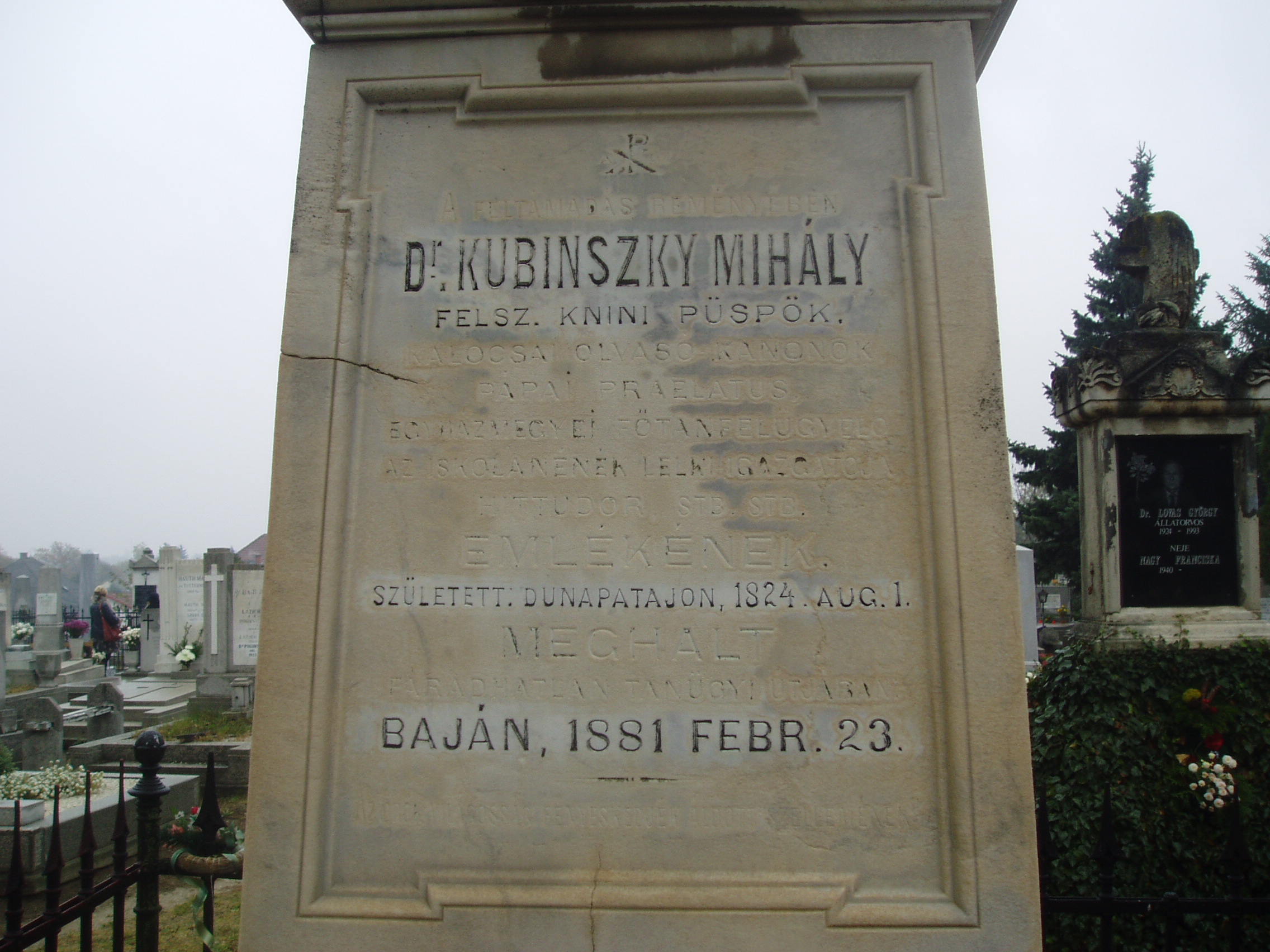 Nyilvános 1191 | 3854 | Baja, Rókus utca: Rókus temető - Kubinszky Mihály sírja | A Rókus temetőben nyugszik a Baján elhunyt Kubinszky Mihály (1824-1881), címzetes tinnini püspök, pápai prelátus, egyházmegyei főfelügyelő, a magyar tanárképzés egyik előmozdítója. Jelentős adománnyal járult hozzá a kalocsai iskolanővérek bajai iskolájának (lásd: Baja, Katona József u. 1-3.) felépítéséhez. Kubinszky a csángók egyik első magyarországi kutatója is volt, s a Szent László Társulat keretén belül lépéseket tett egy ottani magyar nyelvű tanítóképző felállítása érdekében. Síremlékét a Bajavidéki Rk. Néptanítói Egylet közadakozásból állíttatta fel. A fénykép 2007 októberében készült. Felh. irod.: www.c3.hu/~aevk/hely_ism.html Vincze Gábor: A moldvai magyar etnikai csoport a román nemzetépítés árnyékában. = www.csango.hu |
