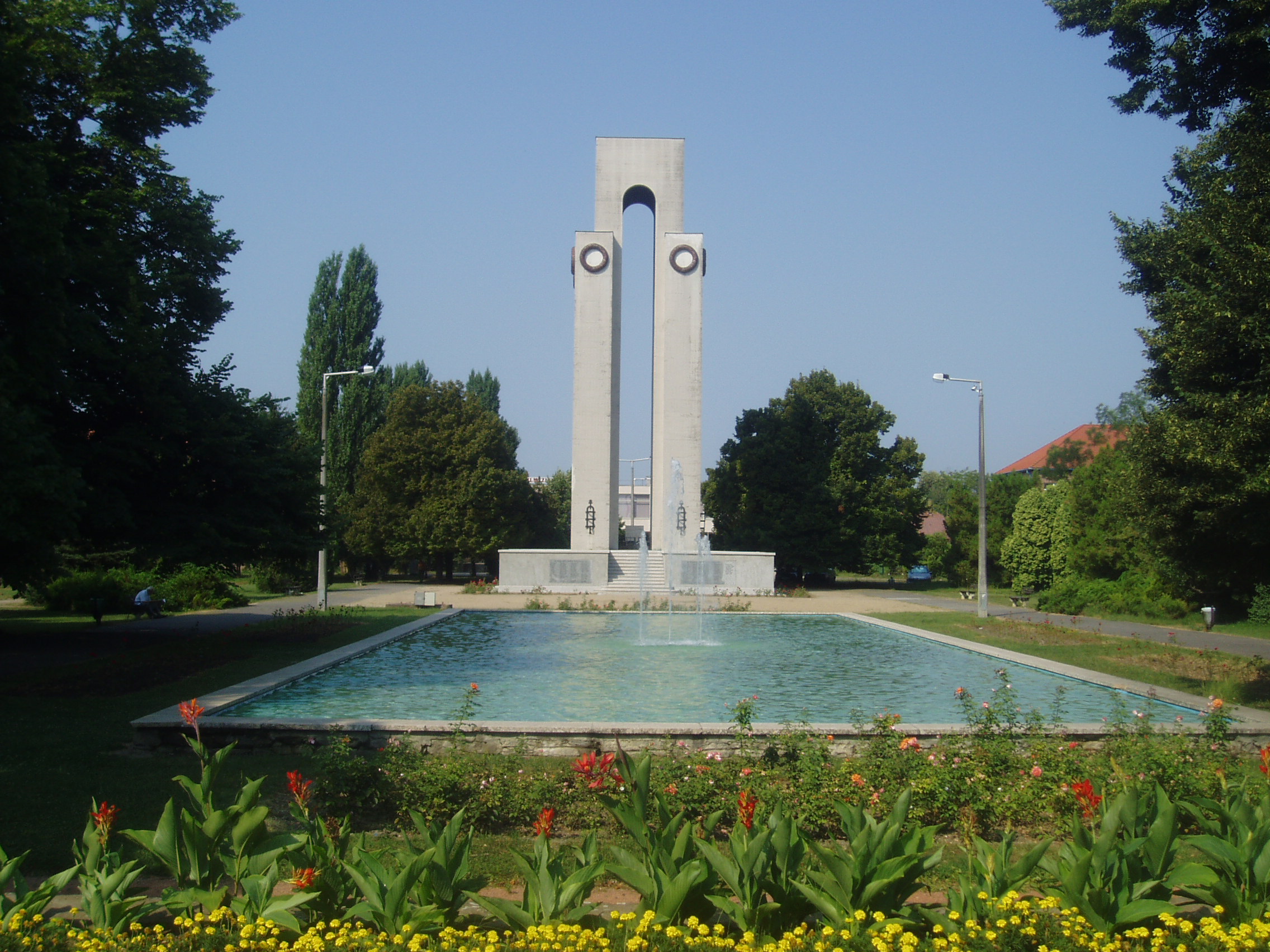 Nyilvános 1706 | 4879 | Rövid leírás | Teljes leírás (827 B) | Mohács, Hősök parkja: Hősök emlékműve Az egykori vásártérből Árkay Bertalan tervei alapján átalakított Hősök parkjában áll az I. és II. világháború áldozatai előtt tisztelgő hősi emlékmű. Az I. világháborút követően Visy Zoltán pécsi műépítész tervei szerint 1935-ben építették fel a négy oszlopon nyugvó, 24 méter magas emlékművet. Így rótta le kegyeletét a város a harcokban elhunyt 439 mohácsi hős emléke előtt. Erre az emlékműre került a II. világháború áldozatainak és az 1956-os forradalom hőseinek neve is. A fénykép 2006 júliusában készült. Felh. irod.: Látnivalók Pécsett és Baranyában. Miskolc, Well-PRess, 1998 www.mohacs.hu www.vendegvaro.hu |