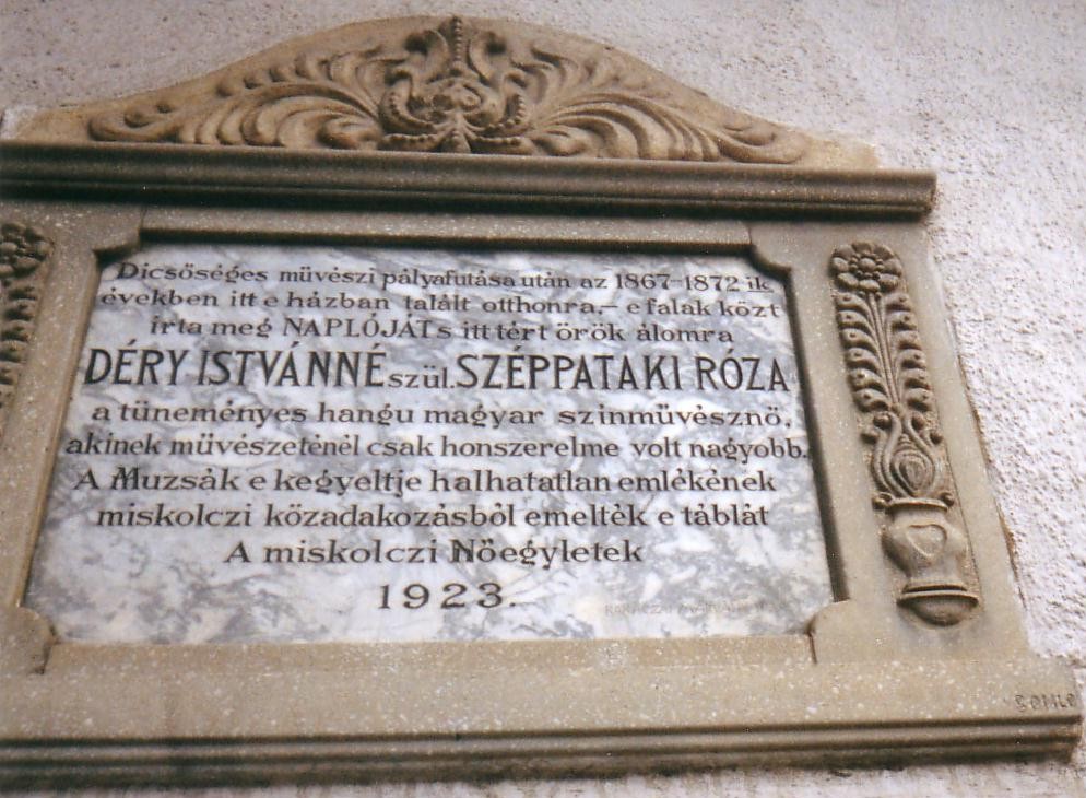 Nyilvános 1579 | 3757 | Miskolc, Hunyadi utca 52. | Ennek a háznak udvari kis lakrészében élt húgával együtt 1867-től haláláig, 1872-ig Déryné Széppataki Róza. A főépület utcai homlokzatát 1923-ban jelölték meg emléktáblával. A színi pályáról 1847-ben visszavonult színésznő–énekesnő férje halála után öt évvel költözött ide a szintén özvegyi sorban élő Kilényi Dávidné Széppataki Johannához, aki itt bérelt kis lakást. S nem sokkal később, egy miskolci meghitt barátnőjének, gondviselőjének Pesten élő könyvtáros fivére, Egervári Ödön biztatására itt, utolsó otthonában kezdte el írni híres emlékiratait. Benne kicsi gyermekkorától egész részletességgel beszéli el életét, pályáját. (Művét gyakran emlegetik naplóként is — helytelenül, mert jóval az események után vetette papírra.) Utolsó három évét ez töltötte ki: betegsége, gyengesége súlyosbodott, látása erősen meggyengült, többször hosszú heteken át nem tudott tollat venni a kezébe, de emberfeletti munkát végzett. Írásművének csak a terjedelme több, mint ezer nyomtatott oldal. A csodálatos memóriával megőrzött események leírása forrásként is felbecsülhetetlen, emellett nagy irodalmi értéke is van. Élete krónikájának papírra vetésével az 1840-es évek elejéig jutott el; 1872. szeptember 29-én hunyt el otthonában. Sírja is Miskolcon található (lásd: Szent Anna temető). A fénykép 2002 nyarán készült. Felh. irod.: Cenner Mihály: Déryné alkonya. = A Miskolci Herman Ottó Múzeum Közleményei 14/1975. Saád Andor: Emlékek Dérynéről és húgáról, Széppataki Johannáról. = A Miskolci Herman Ottó Múzeum Közleményei 8. |