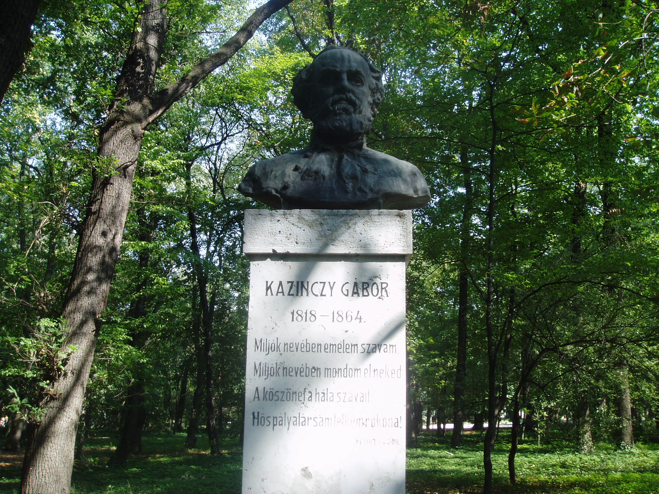 Nyilvános 1124 | 1828 | Sárospatak, Iskolakert: Kazinczy Gábor szobra | A Református Kollégium (lásd: Sárospatak, Rákóczi u. 1.) bejáratával szemben találjuk az Iskolakertnek nevezett parkot. Az 1980-as években természetvédelmi területté nyilvánított Iskolakert sajátos nemzeti érték, mely egyedülálló az országban. Sétányai mentén Patakhoz kötődő jeles személyiségek szobrai állnak. Kazinczy Gábor (1818-1864) bronz mellszobrát, Maugsch Gyula alkotását 1937-ben avatták fel a Kossuth Kollégiumhoz vezető út jobb oldalán. Nagybátyja, Kazinczy Ferenc példáján felbuzdulva már tizenhárom éves korában elhatározta, hogy író lesz. Népbarát című lapja köré egész írókör tömörült. Későbbi életében már a politika játszotta a vezető szerepet: a reformellenzék egyik legnépszerűbb alakja volt. Szónoki tehetsége, melyet Petőfi is magasztalt, kortársai véleménye szerint Kossuthéval vetekedett. A szabadságharc bukása után hazája sorsa felett kétségbeesve a Borsod megyei Bánfalván húzódott meg, és csak 1861-ben lépett újra a nyilvánosság elé élete egyik legnagyobb hatású országgyűlési beszédével, majd reményeiben csalatkozva újra és most már véglegesen eltemetkezett magányába. A fénykép 2007 augusztusában készült. Felh. irod.: Látnivalók Borsod-Abaúj-Zemplén megyében. Miskolc, Well-PRess, 1995 www.sarospatak.hu/nevezetessegek A magyar irodalom története 3. kötet. Szerk. Sőtér István. Bp. Akadémiai Kiadó, 1965 |
