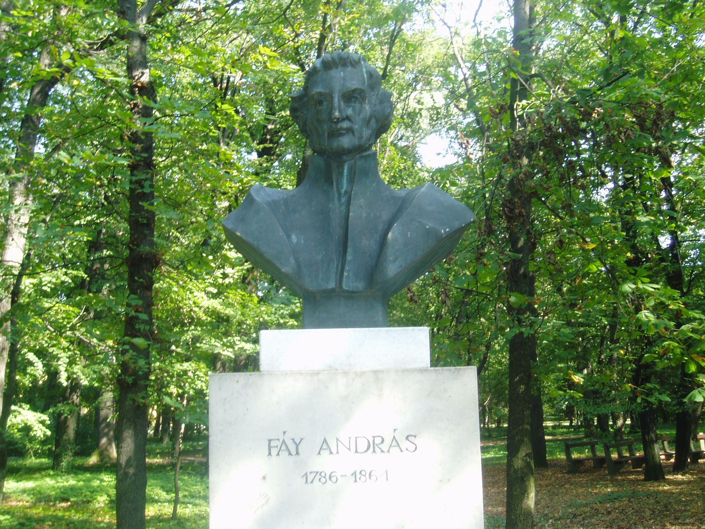 Nyilvános 1102 | 1857 | Sárospatak, Iskolakert: Fáy András szobra | A Református Kollégium (lásd: Sárospatak, Rákóczi u. 1.) bejáratával szemben találjuk az Iskolakertnek nevezett parkot. Az 1980-as években természetvédelmi területté nyilvánított Iskolakert sajátos nemzeti érték, mely egyedülálló az országban. Sétányai mentén Patakhoz kötődő jeles személyiségek szobrai állnak. Fáy András (1786-1864) bronzból készült mellszobra az Iskolakerti szoborsétányon található. Szathmáry Gyöngyi szobrászművész alkotását 1986-ban avatták fel. "A haza mindenese" 1893 és 1798 között tanult a kollégiumban (lásd: Sárospatak, Rákóczi u. 1.), majd a pozsonyi líceum után itt fejezte be középiskolai tanulmányait. A fénykép 2007 augusztusában készült. Felh. irod.: Látnivalók Borsod-Abaúj-Zemplén megyében. Miskolc, Well-PRess, 1995 www.sarospatak.hu/nevezetessegek Erős Zoltán: Magyar irodalmi helynevek A-tól Z-ig. Bp. Kis-Lant Kiadó, 1995 |