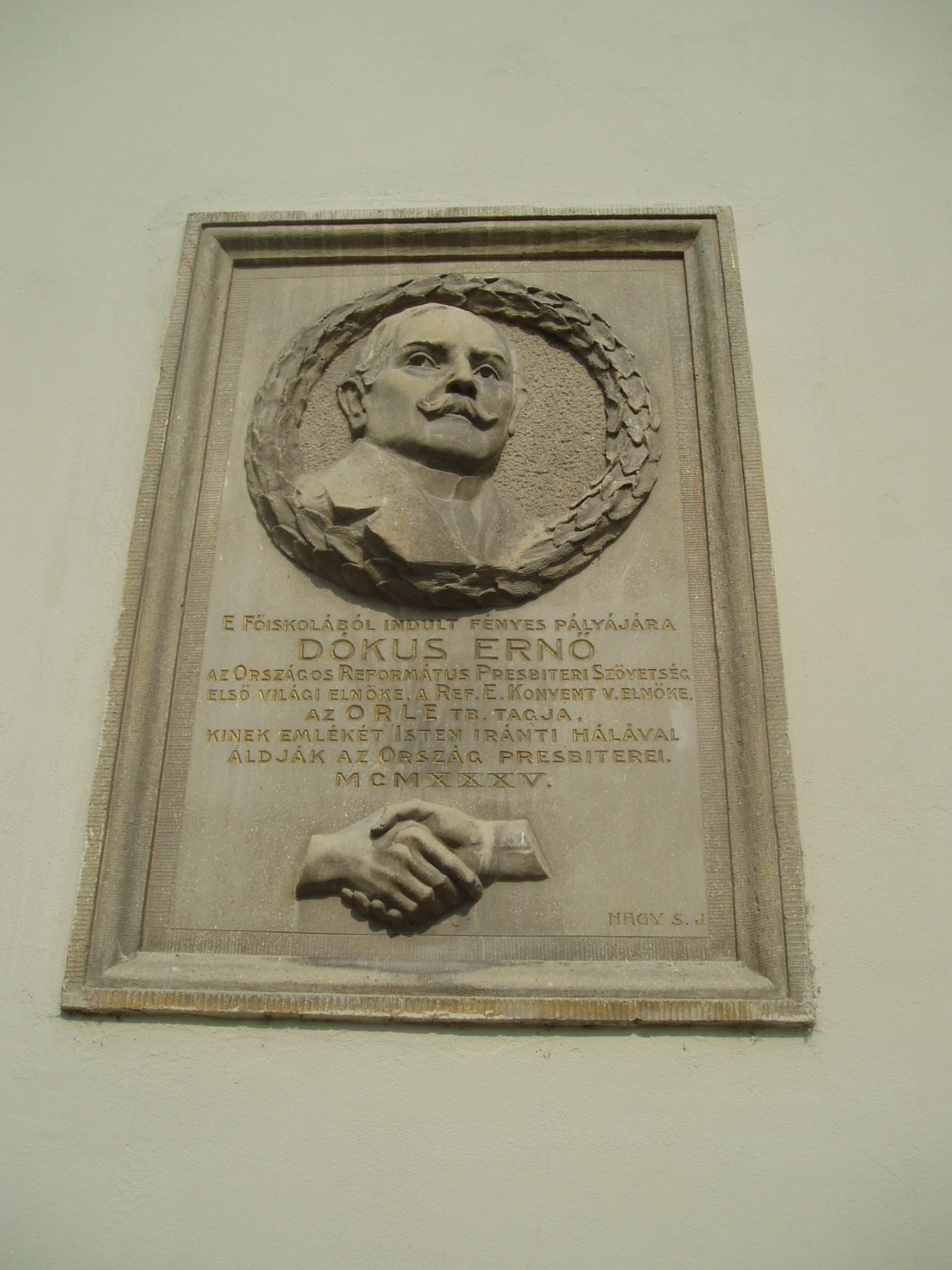 Nyilvános 1074 | 1619 | Sárospatak, Rákóczi utca 1. Református Kollégium | A kollégium főépülete, a Nagy Kollégium a Rákóczi út északi végén található, mely 1804–1814 között korai klasszicista stílusban épült. Szép ráccsal ellátott, háromíves nyílású kapuzat vezet be az un. „nagyportá”-ba, amelyet két sor vaskos pillér három hajóra oszt. Kétoldalt a falakon az iskolatörténet néhány fontosabb eseményének, illetve a kollégium nagy alakjainak domborművű ábrázolásait helyezték el. A képen Dókus Ernő egykori pataki diák, az Országos Református Presbiteri Szövetség első világi elnöke domborműves emléktáblája látható. A fénykép 2007 augusztusában készült. Felh. irod.: Détsy Mihály: Sárospatak. Bp. Corvina, 1974 Látnivalók Borsod-Abaúj-Zemplén megyében. Miskolc, Well-PRess, 1995 www.sarospatak.hu/nevezetessegek |