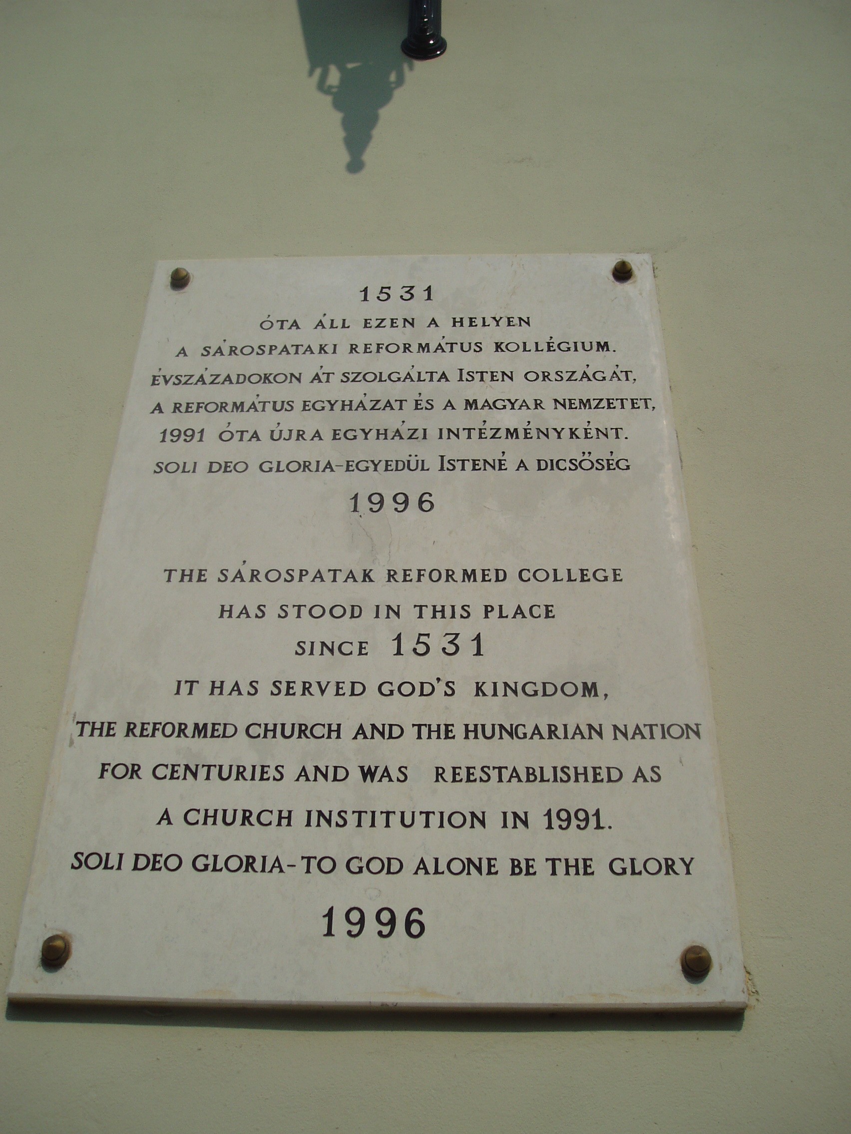 Nyilvános 1050 | 1546 | Sárospatak, Rákóczi utca 1. Református Kollégium | A kollégium főépülete, a Nagy Kollégium a Rákóczi út északi végén található, mely 1804–1814 között korai klasszicista stílusban épült. Szép ráccsal ellátott, háromíves nyílású kapuzat vezet be az un. „nagyportá”-ba, amelyet két sor vaskos pillér három hajóra oszt. Kétoldalt a falakon az iskolatörténet néhány fontosabb eseményének, illetve a kollégium nagy alakjainak bronz domborművű ábrázolásait helyezték el. Az 1996-ban állított feliratos tábla arról emlékezik meg, hogy a pataki kollégium 1531 óta áll ezen a helyen. A fénykép 2007 augusztusában készült. Felh. irod.: Détsy Mihály: Sárospatak. Bp. Corvina, 1974 Látnivalók Borsod-Abaúj-Zemplén megyében. Miskolc, Well-PRess, 1995 www.sarospatak.hu/nevezetessegek |