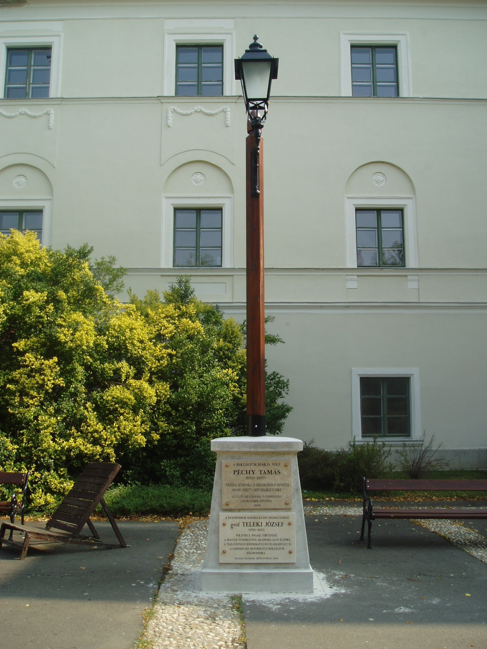 Nyilvános 1101 | 1569 | Sárospatak, Rákóczi utca 1. Református Kollégium | A kollégium főépülete, a Nagy Kollégium a Rákóczi út északi végén található, mely 1804–1814 között korai klasszicista stílusban épült. Szép ráccsal ellátott, háromíves nyílású kapuzaton át jut a látogató az udvarra. Az 1990-es évek közepétől helyeznek el emléktáblákat az itt felállított kandeláberek talapzatán. A felső feliratos tábla Péchy Tamás (1829-1897) politikusnak állít emléket, aki egykor pataki diák volt. Az alsó emléktáblán gróf Teleki József (1790-1855) neve olvasható. A reformkor egyik kimagasló egyénisége politikus, jogász, történész, a Tudományos Akadémia első elnöke, s a Tiszáninneni Református Egyházkerület és pataki kollégium főgondnoka is volt. A fénykép 2007 augusztusában készült. Felh. irod.: Détsy Mihály: Sárospatak. Bp. Corvina, 1974 Látnivalók Borsod-Abaúj-Zemplén megyében. Miskolc, Well-PRess, 1995 www.sarospatak.hu/nevezetessegek |