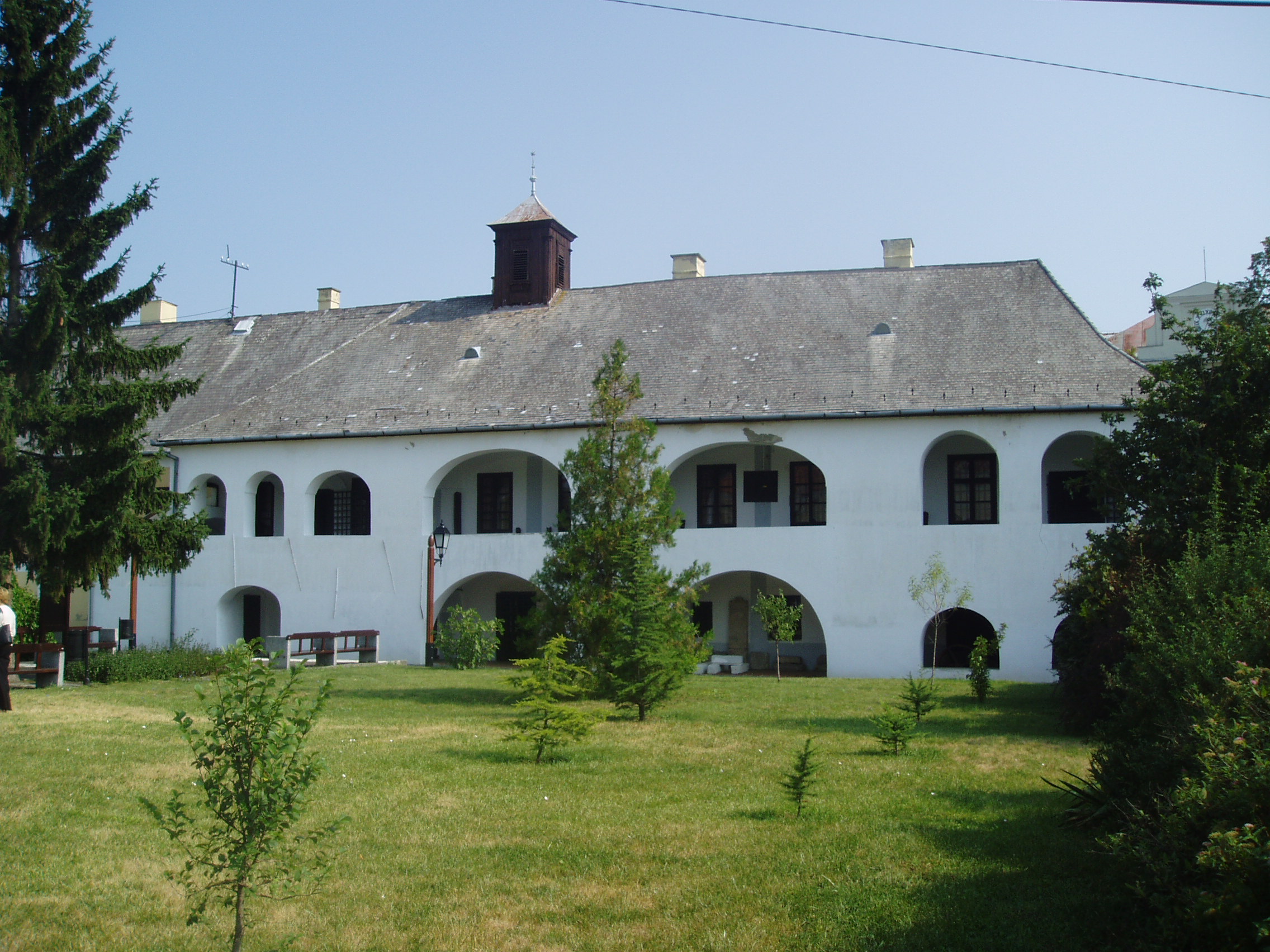 Nyilvános 1031 | 1561 | Sárospatak, Rákóczi utca 1. Református Kollégium | A Kollégium főépületének szárnyai által határolt tágas udvarban áll a régi iskolaépületek utolsó maradványa, az ún. Berna-sor. 1771/72-ben a fizika oktatása számára és a fizikaprofesszor lakásául épült. Az egyemeletes, hosszú szárny déli oldalát később kétszintes, árkádos tornáccal bővítették, feljáróval a nyugati oldalon. Az épület a korabeli provinciális magyar építészet szép példája. Az emelet boltozott termeiben a kollégium történetét bemutató kiállítás látható. A fénykép 2007 augusztusában készült. Felh. irod.: Détsy Mihály: Sárospatak. Bp. Corvina, 1974 |