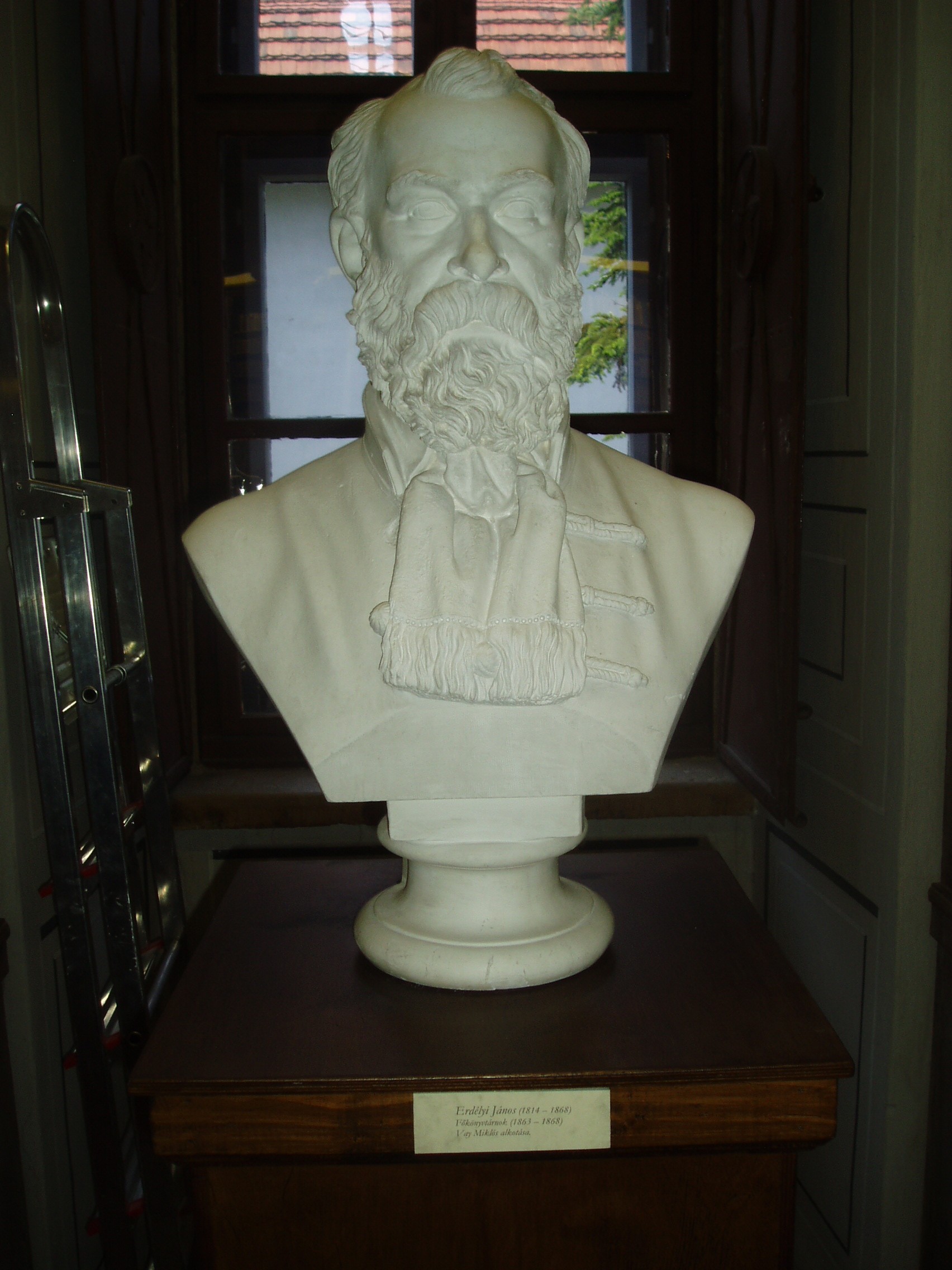 Nyilvános 1069 | 1519 | Sárospatak, Rákóczi utca 1. Református Kollégium könyvtára | Erdélyi János (1814-1868) költő, kritikus, esztéta, filozófus, tanár mellszobra Vay Miklós alkotása. Erdélyit, miután 1848/49-ben a Nemzeti Színház igazgatója volt, s Világos után üldöztetéseknek volt kitéve, 1851-ben meghívták a sárospataki főiskola bölcseleti tanszékére. 1863-tól a kollégium "könyvtárnoka" lett, ezzel együtt a magyar irodalmi tanszéket foglalta el. Nagyszabású könyvtári terveiből egyedül az állomány szak szerinti elrendezését tudta korai halála előtt megvalósítani. Munkáját utódja, Szinyei Gerzson fejezte be. A fénykép 2007 augusztusában készült. Felh. irod.: www.gradatio.hu/nagykonyvtar |