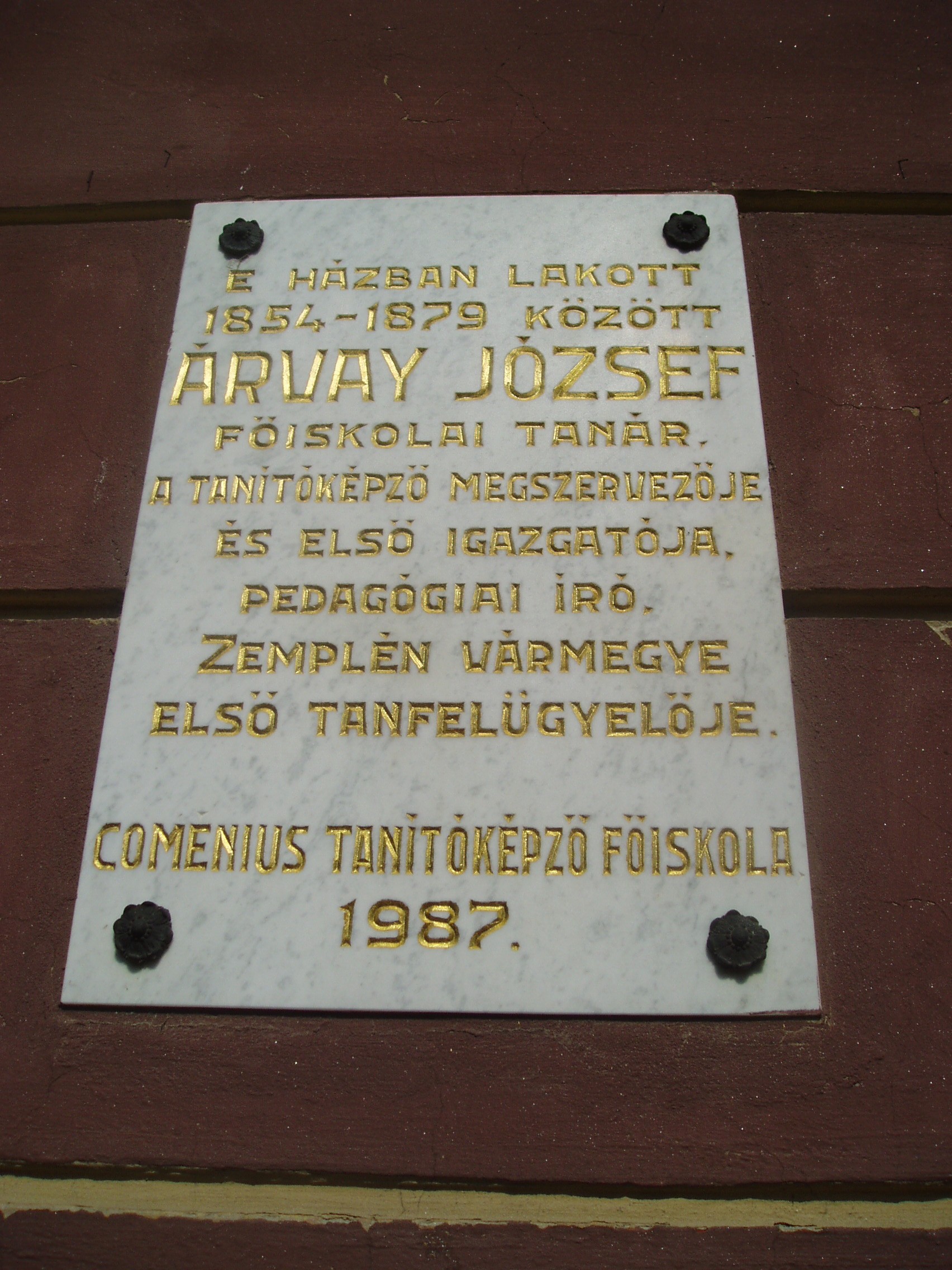 Nyilvános 1386 | 1863 | Sárospatak, Rákóczi utca 12. | A műemlék jellegű lakóház a XIX. század első felében épült későbarokk stílusban. 1854 és 1879 között itt lakott Árvay József (1823-1879) matematika szakos főiskolai tanár, korábbi pataki diák. Ő volt az 1859-ben felállított taítóképző intézet első igazgatója és Zemplén vármegye első tanfelügyelője. Tankönyvírással is foglalkozott. A fénykép 2007 augusztusában készült. Felh. irod.: www.wikipedia.org |