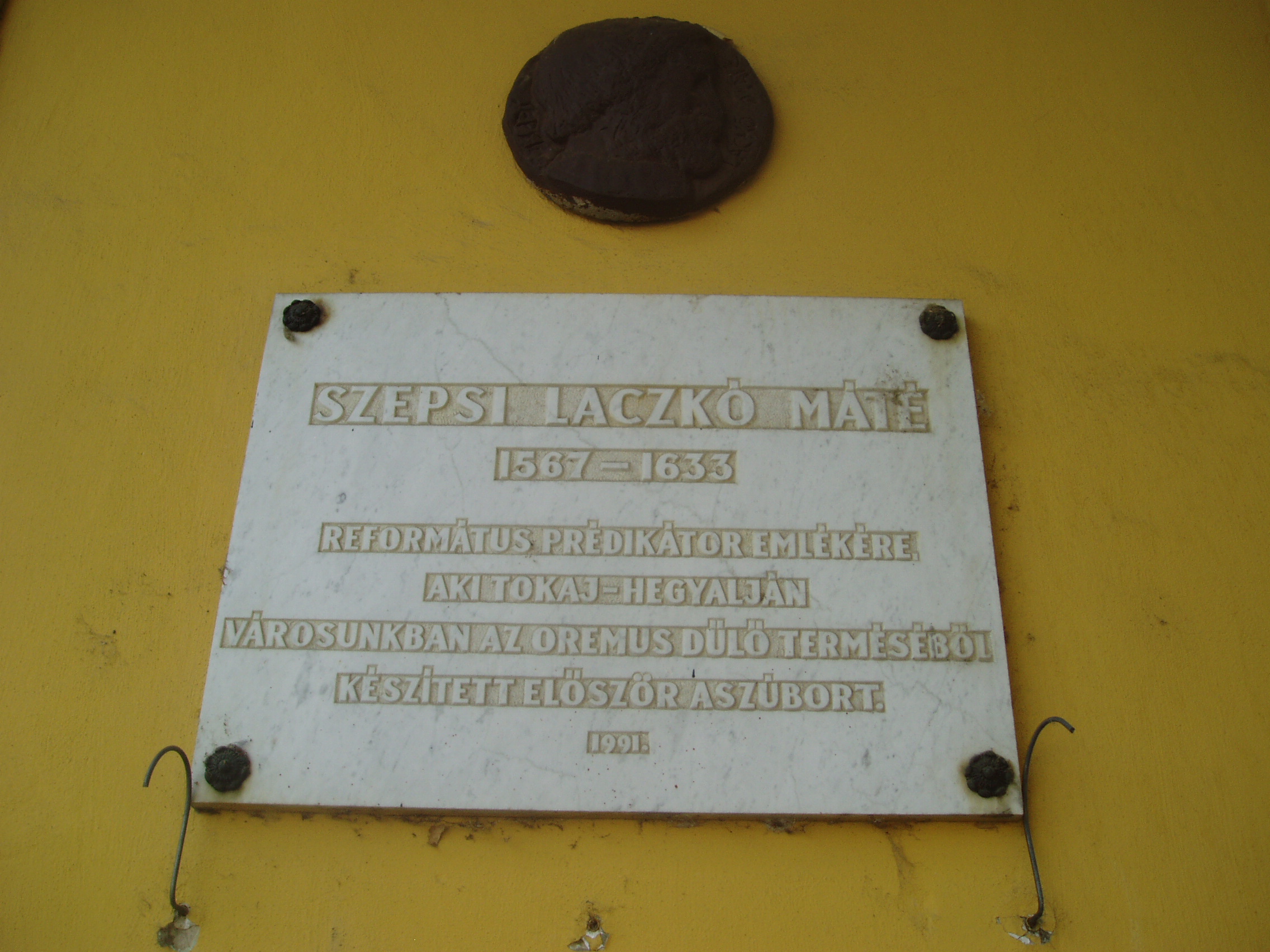 Nyilvános 1053 | 1591 | Sátoraljaújhely, Kossuth tér 24. | A város fő terének egyik szép, régi épületén elhelyezett emléktábla szerint elsőként Sátoraljaújhelyen készített tokaji aszút 1631 körül Szepsi Laczkó Márton (1567-1633) református prédikátor, Lórántffy Zsuzsanna udvari lelkésze a fejedelemasszony számára az Oremus dűlő terméséből. A hagyomány szerint az országot érő támadások miatt későn szüretelt szőlő tartalmazott olyan „beteg” szőlőszemeket is amelyeket ma az aszú készítéséhez használnak. Az elkészült, miseborként is használt italban fedezte fel Szepsi Laczkó Máté a különleges ízvilágot és ajánlotta fel a bort a fejedelemasszonynak. Az aszú készítésének első leírását is neki tulajdonítják. A hagyománynak azonban ellentmond, hogy már az 1590-es években - Szikszai Fabricius Balázs latin–magyar szótárában - használták az „aszú szőlő” kifejezést. A fénykép 2007 augusztusában készült. Felh. irod.: www.tokaj.hu/magyar/atokaji/az-aszu/index.php |