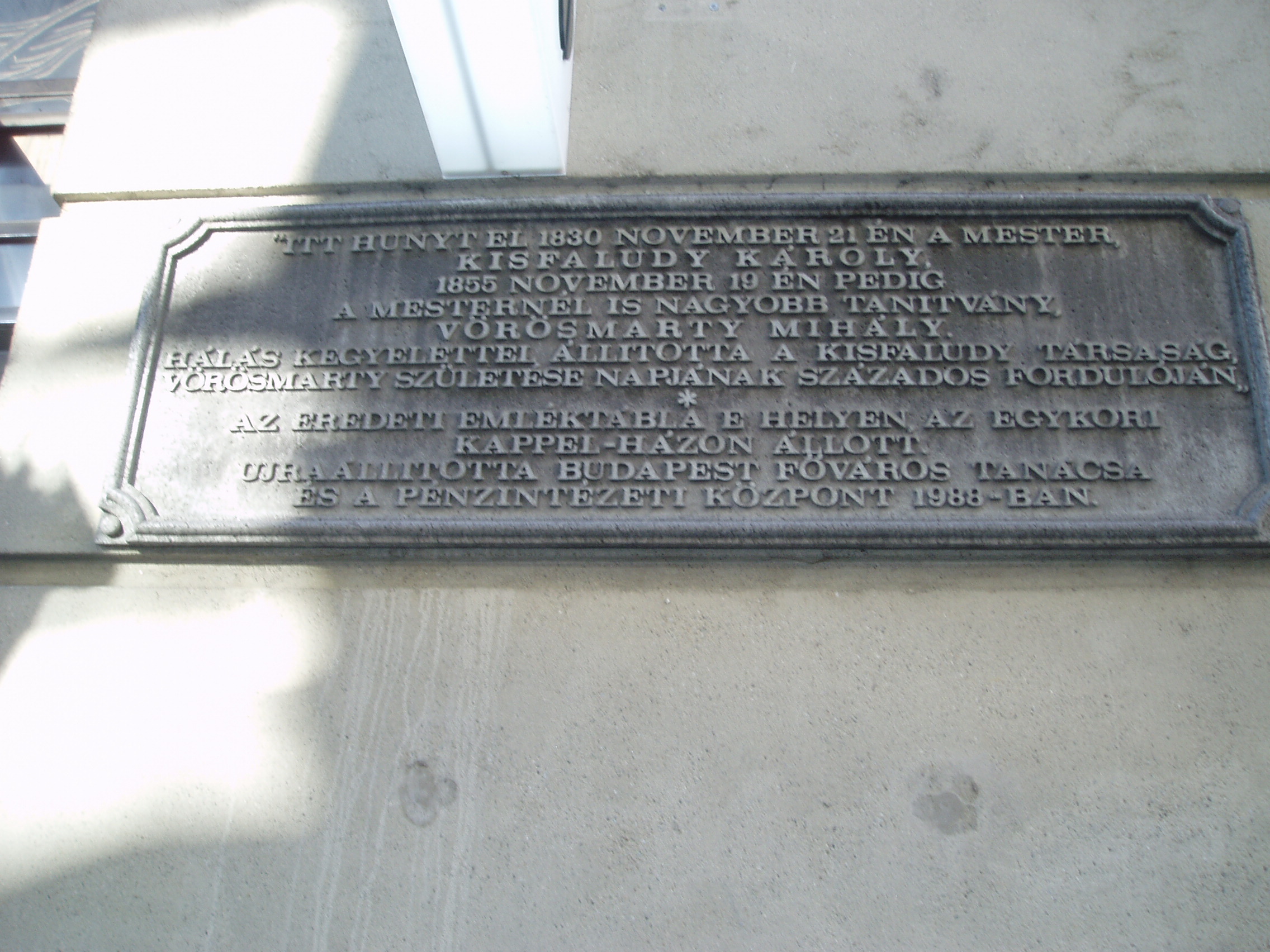 Nyilvános 1123 | 1751 | Budapest, V. Váci utca 19. | A mai irodaépület helyén egykor az ún. Kappel-ház állott (a második világháborúban bombatalálat érte, megmaradt részét az 1960-as években bontották le). A Kappel-házban hunyt el 1830. november 21-én Kisfaludy Károly, majd negyedszázaddal később, 1855. november 19-én Vörösmarty Mihály. Mindkettejüket az udvaron ravatalozták föl. Már az eredeti Kappel-házat is megjelölték a két költő közös emléktáblájával. Az irodaépület elkészülte után azonban új emléktáblát tettek a házra - igaz, az eredeti szöveggel. 2003-ban azonban Ráday Mihály felfedezte az épségben maradt eredeti emléktáblát a Kiscelli Múzeumban, s lépéseket tett, hogy ezt a táblát helyezzék vissza a házra. 2006 őszéig, amikor e fényképet készítettem, javaslata nem vált valóra... Zenei érdekessége is van a helynek: az 1950-es években még állt az eredeti Kappel-ház földszintje, ebben működött a közkedvelt Kedves Presszó. Egyéb lehetőség híján itt zongorázott ekkoriban Cziffra György. Kevéssel ezután külföldön akart szerencsét próbálni, de az AVH elfogta és büntetőtáborba vetette. Csak 1956-ban jutott ki Párizsba, ahol szinte "egycsapásra" világhírű lett. A zongoraművész Ágyúk és virágok címmel írta meg visszaemlékezéseit. A fénykép 2005 májusában készült. Felh. irod.: N. Kósa Judit: Egy békebeli üzenet. = Népszabadság 2006. szept. 16. Erős Zoltán: Magyar irodalmi helynevek A-tól Z-ig. Bp. 1985, Móra Kiadó www.mtv.hu/cikk.php?id=2679 |