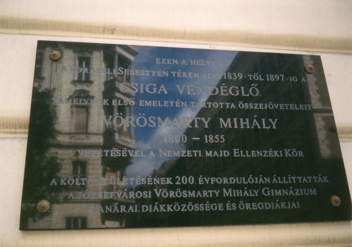 Nyilvános 1245 | 1742 | Budapest, V. Váci utca 38. | Mint a homlokzatán elhelyezett emléktáblán is olvasható, egykor ezen a helyen, az 1930-ig fennállt épületben volt a Csiga vendéglő. Az 1840-es években rendszeresen itt tartotta összejöveteleit a Vörösmarty Mihály körül kialakult baráti társaság, amelyből később kialakult az Ellenzéki Kör. A fénykép 2005 májusában készült. Felh. irod.: Erős Zoltán: Magyar irodalmi helynevek A-tól Z-ig. Bp. Móra Kiadó, 1985 |