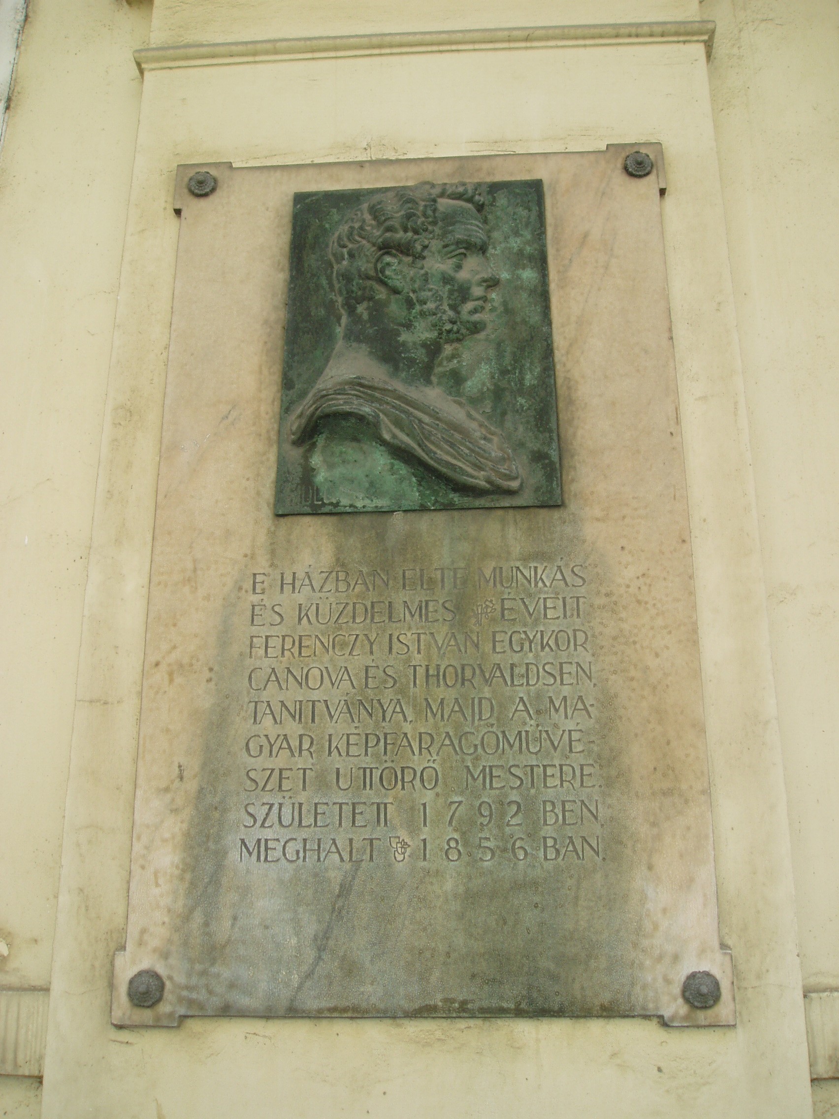 Nyilvános 1181 | 2065 | Budapest I. Országház utca 14. | Egyszerű klasszicista stílusú, kétemeletes városi ház. Falán Sidló Ferenc által készített portrédomborműves emléktábla idézi meg Ferenczy István (1792-1856), az egyik legnagyobb magyar szobrászművész alakját, aki egykor ebben a házban lakott. Ferenczy 1834-ben vásárolta meg az akkor földszintes házat. Hátsó részére emeletet építtetett és 1846-ig itt élt és dolgozott. Mivel külföldi tanulmányútjai és ásatásai jórészt vagyonát is felemésztették, még befejezte nagy művét, a Pesten felállított Kölcsey-szobrot és Rimaszombatba költözött, ahol visszavonulva élt. Ott hunyt el 1856-ban. A házat következő tulajdonosa alakíttatta át mai formájára. A fénykép 2007 májusában készült. Felh. irod.: Zakariás G. Sándor: Budapest. Bp. 1961, Képzőműv. Alap. /Magyarország művészeti emlékei 3./ http://hungart.euroweb.hu/magyar/f/ferenczi/index.html |