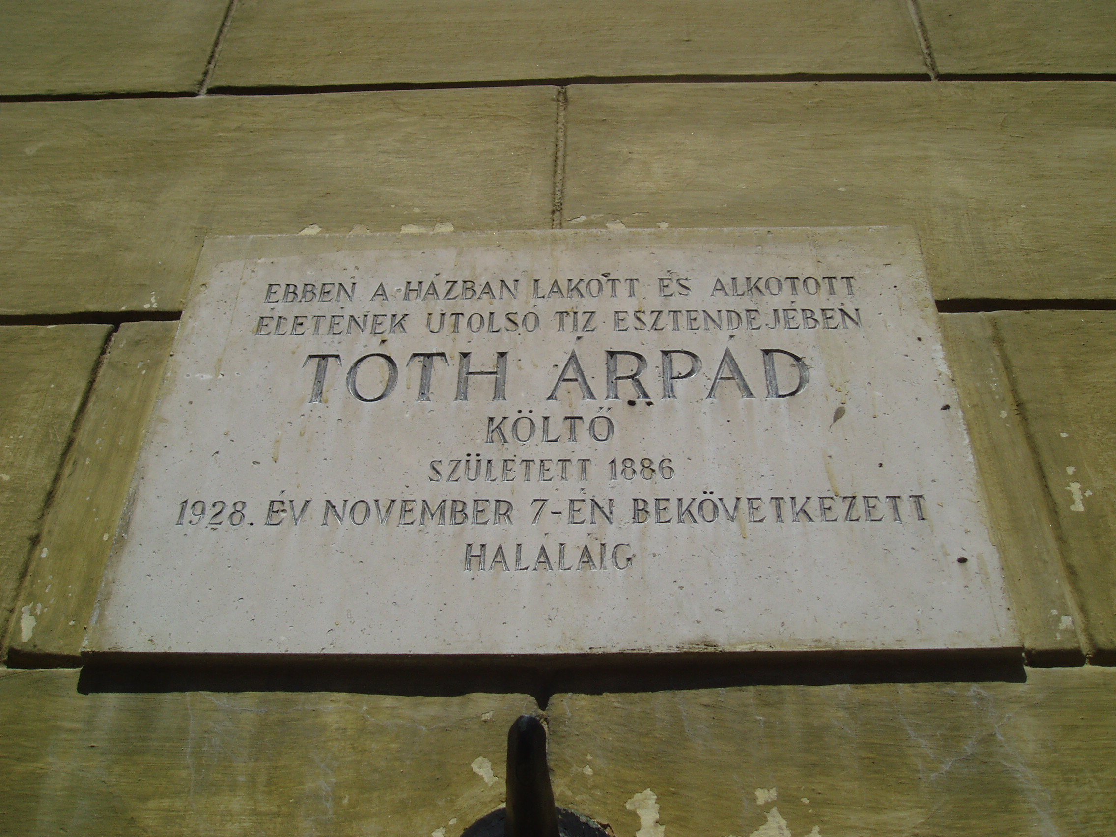 Nyilvános 1178 | 1970 | Budapest I. Táncsics Mihály utca 13. | Az egyemeletes ház középkori alapokra épült. 1823-ban, majd mai formájára 1880-ban alakították át. Mint a homlokzatán elhelyezett emléktáblán is olvasható, itt élt - egy első emeleti kis, bérelt lakásban - élete utolsó tíz évében Tóth Árpád (1886-1928) költő feleségével, Annuskával és 1920-ban született kislányával, Eszterrel. Itt írta Az öröm illan és a Lélektől lélekig c. köteteinek legtöbb versét. Lakásán hunyt el 1928. november 7-én tüdőbajban. Lánya, Tóth Eszter, aki édesapja halálakor mindössze nyolc éves volt, szintén irodalmár - költő, író, műfordító -lett. Édesapjáról, családjáról - köztük apai nagyapjáról, Tóth András szobrászról - emlékezéseket, tanulmányokat írt, bennük sok eredeti forrást, levelet is közzétett. A fénykép 2007 májusában készült. Felh. irod.: Zakariás G. Sándor: Budapest. Bp., Képzőműv. Alap, 1961 /Magyarország művészeti emlékei 3./ Erős Zoltán: Magyar irodalmi helynevek A-tól Z-ig. 2. bőv. átd. kiad. Bp. Kis-Lant Kiadó, 1995 Tóth Eszter: Családi emlékek Tóth Árpádról. Bp. Magvető, 1985 |