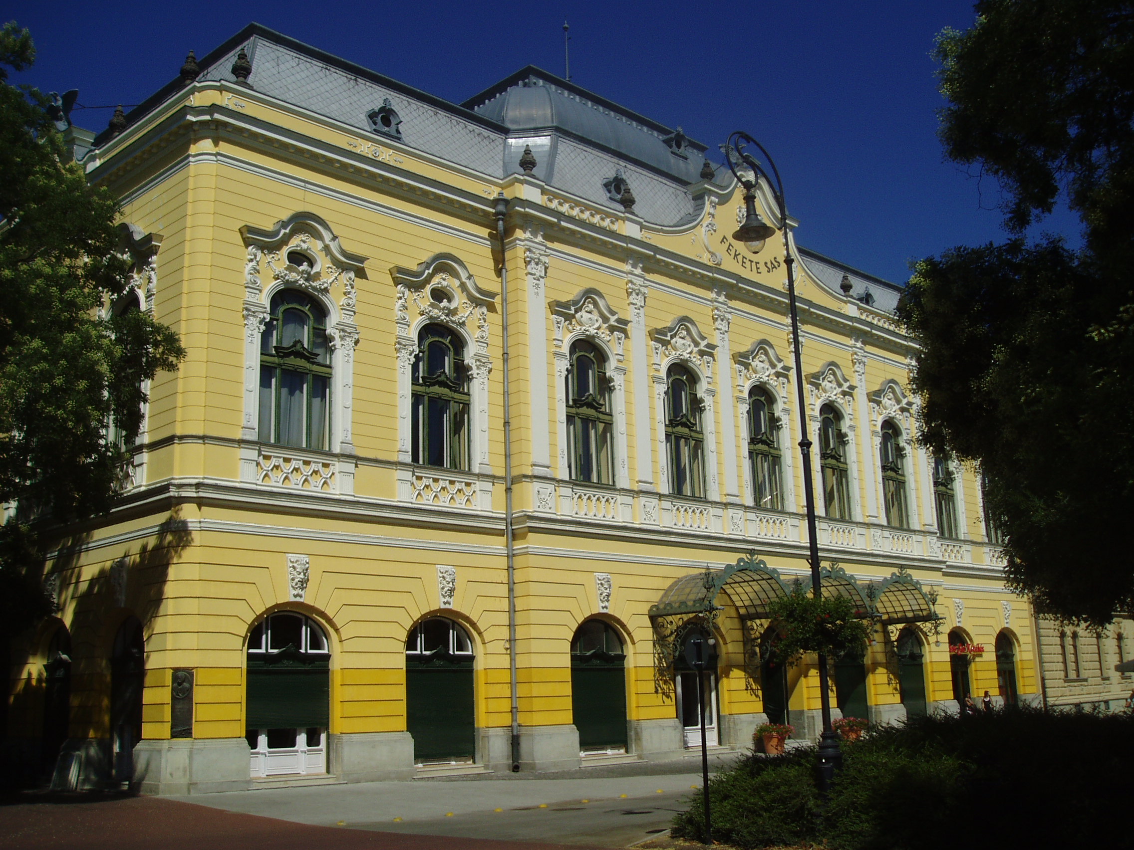 Nyilvános 1429 | 3636 | Hódmezővásárhely, Kossuth tér 3. | A Fekete Sas Szállodát a XX. század elején emelték eklektikus–neobarokk stílusban (1905-ben nyitották meg). A város fő terének egyik meghatározó épületét Pártos Gyula tervezte. Benne található a megye legimpozánsabb díszterme. A mai épület helyén már a XVIII. század elején a később „öreg” Sas-nak nevezett földszintes, majd 1830-ban emeletesre bővített kocsma és vendégfogadó állt. Még nádtetős alakjában Rózsa Sándor búvóhelyeként is szolgált. A XIX. század első felében itt tartották előadásaikat a városban vendégszereplő színtársulatok. 1827. júniusában Kilényi Dávid társulatának tagjaként fellépett itt Déryné Széppataki Róza is. Szintén még az öreg Sasban muzsikált a XIX. század utolsó éveiben 12 tagú bandája élén Czutor Béla (1863—1909). "Béla cigány" a régi Vásárhely zenei életének jellegzetes figurája volt. Muzsikus cigány családba született őstehetség, aki ugyan csak három osztályt járt, de divatos üdülőhelyeken, Tátrafüreden, a Margitszigeten, Herkulesfürdőn, Brassóban lépett fel. Dankó Pista dalainak egyik legavatottabb tolmácsolója volt. Dankó — Pósa Lajos versére — nótát is írt zenéjének kiváló interpretálójáról: "Vásárhelyi sétatéren Béla cigány muzsikál… " A megénekelt sétatér a Kossuth tértől a Fekete Sas Zrínyi utca felőli végéig húzódott. Híres fasorának eleje a mai épület keleti oldalánál (a képen balra) ma is látható. A jelenleg rendezvényházként működő, gyönyörűen felújított épület fasor felőli sarkán márványtábla őrzi Béla cigány emlékét. 1921-ben már a mai épületben tartott előadást Juhász Gyula munkásmatiné keretében Petőfiről és Csokonairól. Móra Ferenc is szívesen látott és hallott előadóként lépett fel itt, s olvasta fel remek novelláit. Az országot járó Móricz Zsigmond Bibó Lajos társaságában szívesen időzött a szálló földszinti éttermében, s jegyezte fel az itt hallott históriákat. A fénykép 2007 júliusában készült. Felh. irod.: Barangolások Csongrád megyében. Miskolc, Well-PRess, 1997 /Vendégváró/ Arató László - Batyi Zoltán: Hódmezővásárhely az alföldi művészváros. Hódmezővásárhely, 2004 Patariczáné Kelecsényi Magdolna - Szigeti János: Lakóhelyünk Hódmezővásárhely. 2. bőv. kiad. Hódmezővásárhely, 2000 Kőszegfalvi Ferenc: Hódmezővásárhelyi évfordulók. = Honismeret 1983. 4. |