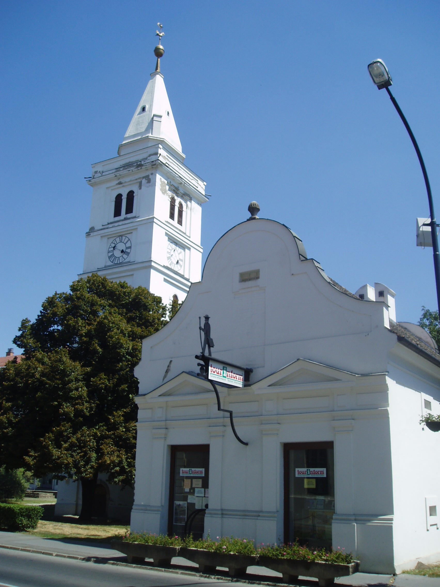 Nyilvános 1480 | 3731 | Hódmezővásárhely, Kossuth tér: Református Ótemplom és Magtár | A parkosított Kossuth tér a város főtere. Délkeleti sarkán áll a város legrégibb, legjelentősebb műemléke, a református ótemplom és a vele hajdan szerves kapcsolatban álló magtár. A templom fiókos dongaboltozatú hajója 1721 és 1723 között készült el. Két évtized múlva a templom köré lőréses téglafalat építettek, amelynek keleti és déli szakasza ma is megvan. A templom tornyában helyezték el a nagyecsedi kastély II. Rákóczi Ferenctől elkobzott óráját, csengettyűjét, amelyeket a város akkori földesura, gróf Károlyi Sándor adott el az egyháznak. A templom hajdan kazettás, festett, stilizált virágmotívumokkal díszített fatáblás mennyezetét és karzatát a budapesti Iparművészeti Múzeum, a papok padját a helyi Tornyai János Múzeum (lásd: Hódmezővásárhely, Szántó–Kovács János u. 16–18.) őrzi. A templom jeles lelkésze volt Szőnyi Benjámin (1717–1794). Megválasztása után, 1743-ban külföldi tanulmányútra ment: az Odera–menti Frankfurt, Leyden és Utrecht egyetemein hallgatott teológiát. Hazaérkezése után csaknem ötven évig működött ebben a templomban. Országos elismerést szerzett teológiai témájú könyveivel, valamint számos kiadást megért "Szentek hegedűje" című énekeskönyvével. Feliratos sírköve — epitáfiuma — a templom falánál látható. A templomi magtárat 1744-ben építtette az egyház a lakosságtól egyházi adóként begyűjtött termények és tárgyak tárolására. A jellegzetesen barokk homlokzatú épületben ma a Tourinform iroda működik. A fénykép 2007 júliusában készült. Felh. irod.: Barangolások Csongrád megyében. Miskolc, Well-PRess, 1997 /Vendégváró/ Arató László - Batyi Zoltán: Hódmezővásárhely az alföldi művészváros. Hódmezővásárhely, 2004 |