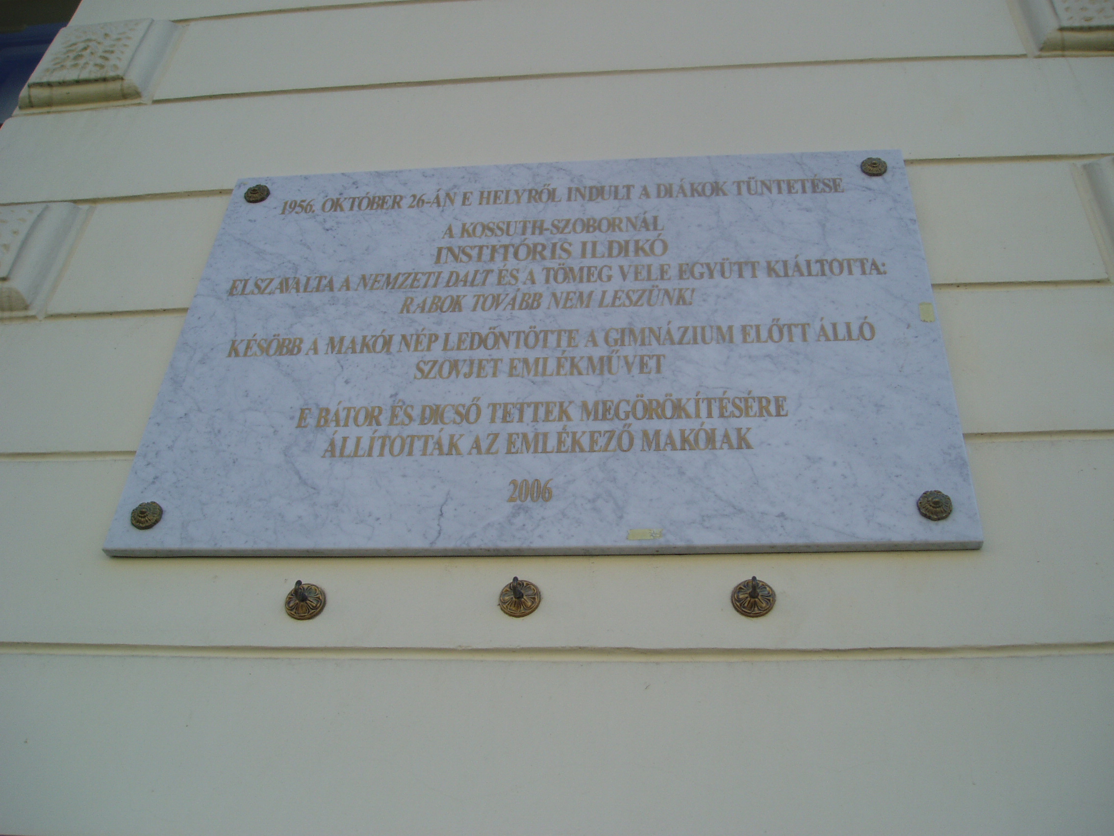 Nyilvános 1076 | 1546 | Makó, Csanád vezér tér 6. József Attila Gimnázium | A város központjából északra nyílik a sugárútszerű Csanád vezér tér. Nyugati oldalán áll a József Attila Gimnázium 1895-ben, eklektikus stílusban, Gerle Lajos tervei alapján emelt épülete. Itt tanított négy évig Juhász Gyula, itt tanult József Attila, majd Erdei Ferenc. 2006-ban, az 50. évfordulón emléktáblán örökítették meg, hogy 1956. október 26-án a gimnázium elől indult a diákok felvonulása a Kossuth-szoborhoz. Később a makóiak ledöntötték az iskola előtt álló szovjet emlékművet. A fénykép 2007 júliusában készült. Felh. irod.: Barangolások Csongrád megyében. Miskolc, Well-PRess, 1997 |
